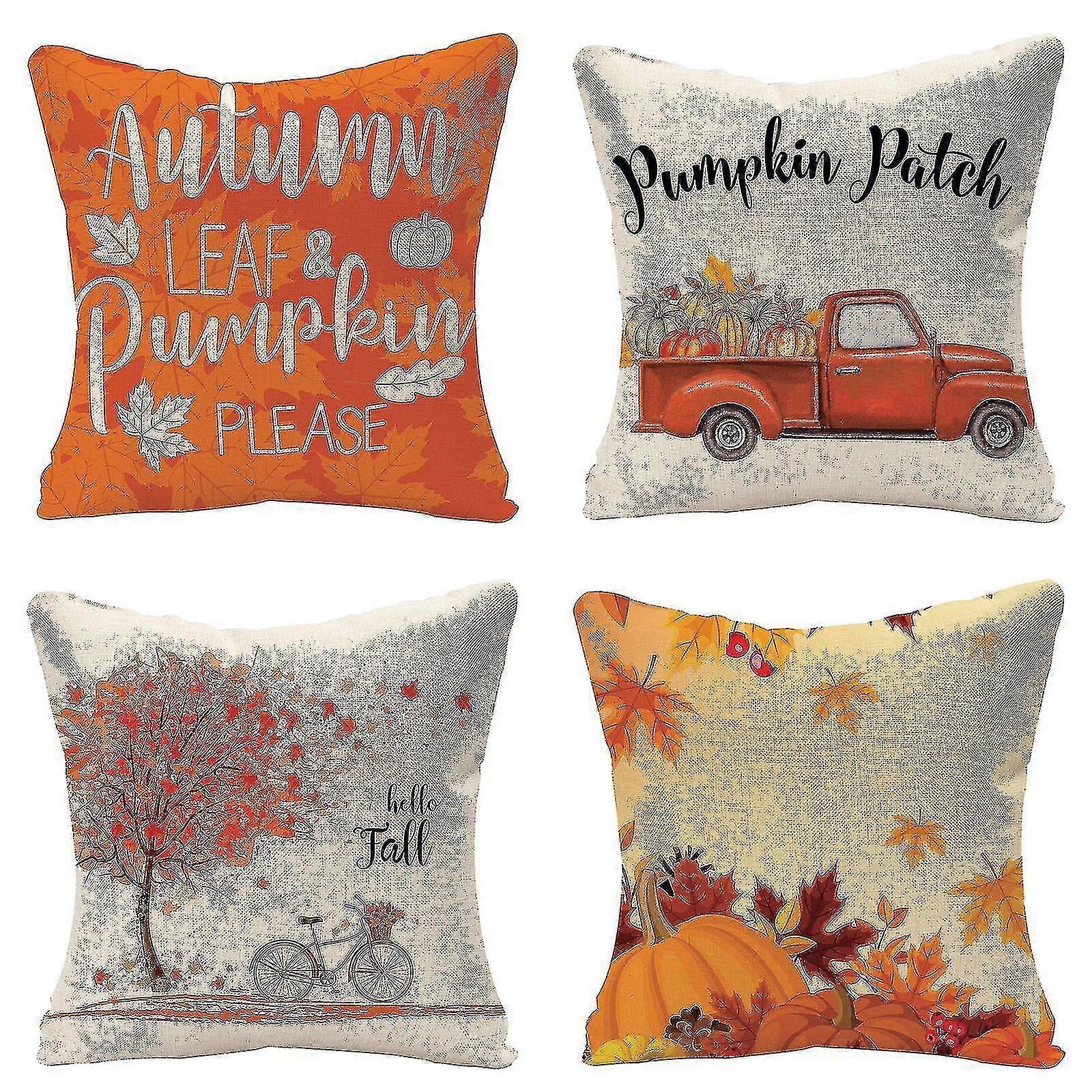 Set Of 4 Decorative Fall Pillowcases - Fall Pumpkin Farmhouse Linen 18 X 18" Pillow Cushion