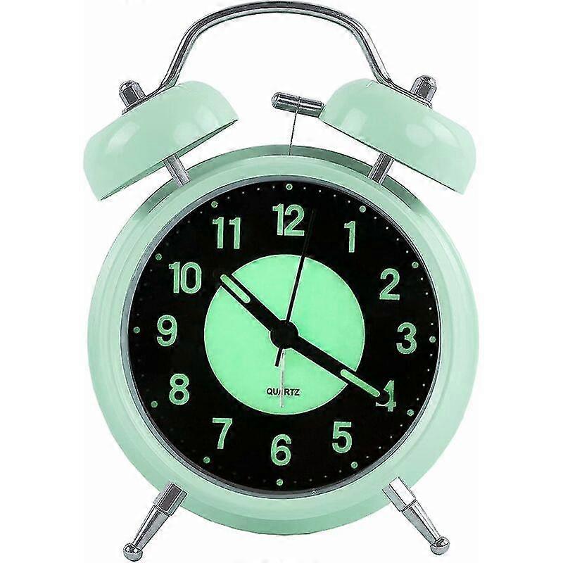 4 Inch Lighted Alarm Clock, Retro Analog Dual Bell Ticketless Quartz Clock With Sound Alarm And Night Light, Metal Case (green)