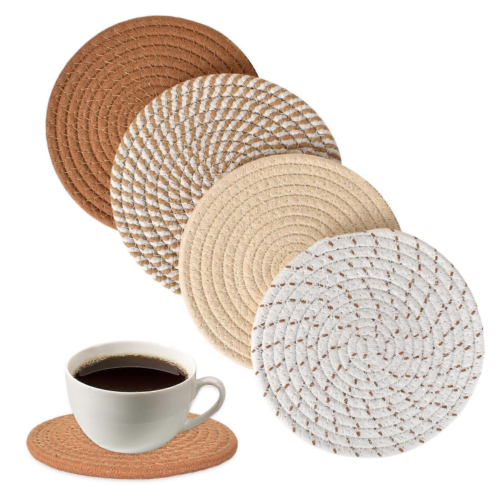 1.Package includes: You will receive 4 tripods with different patterns and colors. The pot holders are 18 cm in diameter and are 8 mm thick and fit most pot, bowl and plate sizes. 2. Cotton Rope Material: Our insulation pads are made of environmentally friendly cotton rope, which has not been dyed with chemicals. They are very durable and not easy to deform. They do not contain metal or plastic parts to ensure the of children and pets. 3.Heat Resistant Material: The dish coaster is a durable and heat resistant environmentally friendly insulation material, which is good to use for hot dishes, hot drinks in the kitchen or on the dining table, and effectively protects your table and countertop from hot pots. 4.Water Absorbing Material: These woven pot holders are made of highly absorbent material, which can effectively absorb moisture to keep your desk dry. This allows you to easily solve annoying moisture problems on your furniture, so you can enjoy your happy moments and your favourite drink.