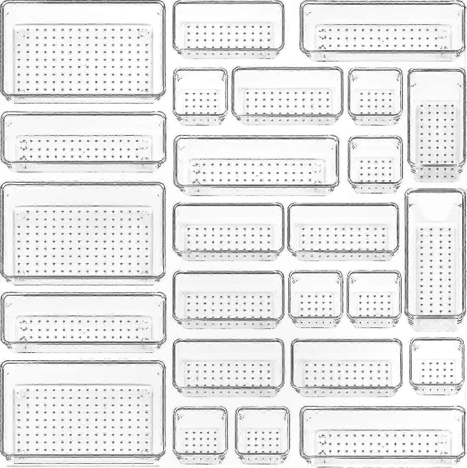 4-Size Plastic Drawer Organizer Set, 25pcs Clear Storage Trays for Bathroom, Vanity, Makeup, Jewelry, Kitchen Items