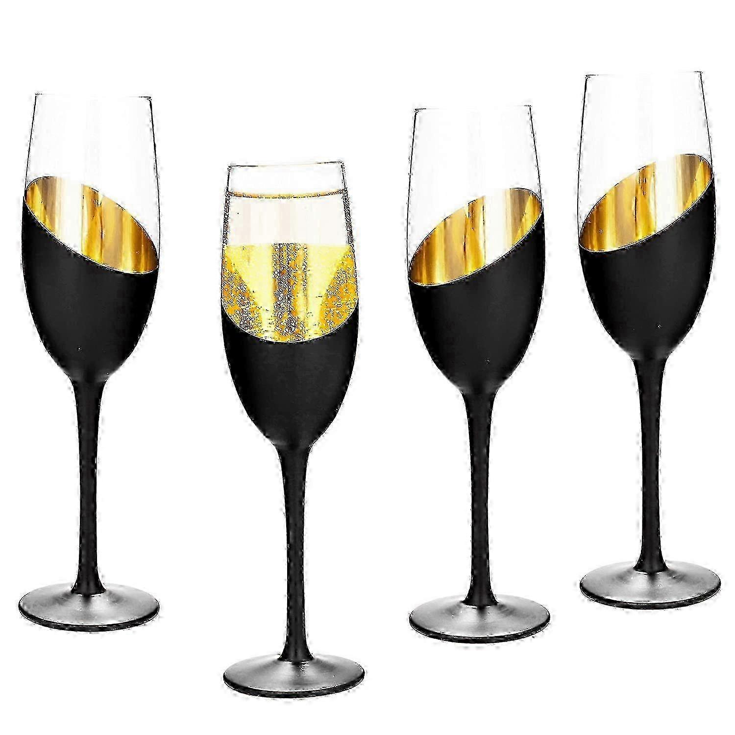 1. Set of 4 decorative modern black and gold toned champagne flute glasses with tilted design, great for toasting, New Years Eve, anniversaries, and other celebrations and special occasions 2. Perfect for drinking any type of sparkling wine, prosecco, champagne, cocktail, or non-alcoholic beverage each glass can hold approximately 8 oz of liquid 3. Striking black and gold finish creates a fascinating display of light with the flute's contents and adds an elegant look to your table settings 4. Each champagne flute glass can hold approximately 8 oz of liquid Hand wash only Not dishwasher Note: Due to the light and screen setting difference, the item's color may be slightly different from the pictures. Please allow slight dimension difference due to different manual measurement. Sold by-Minnanxin