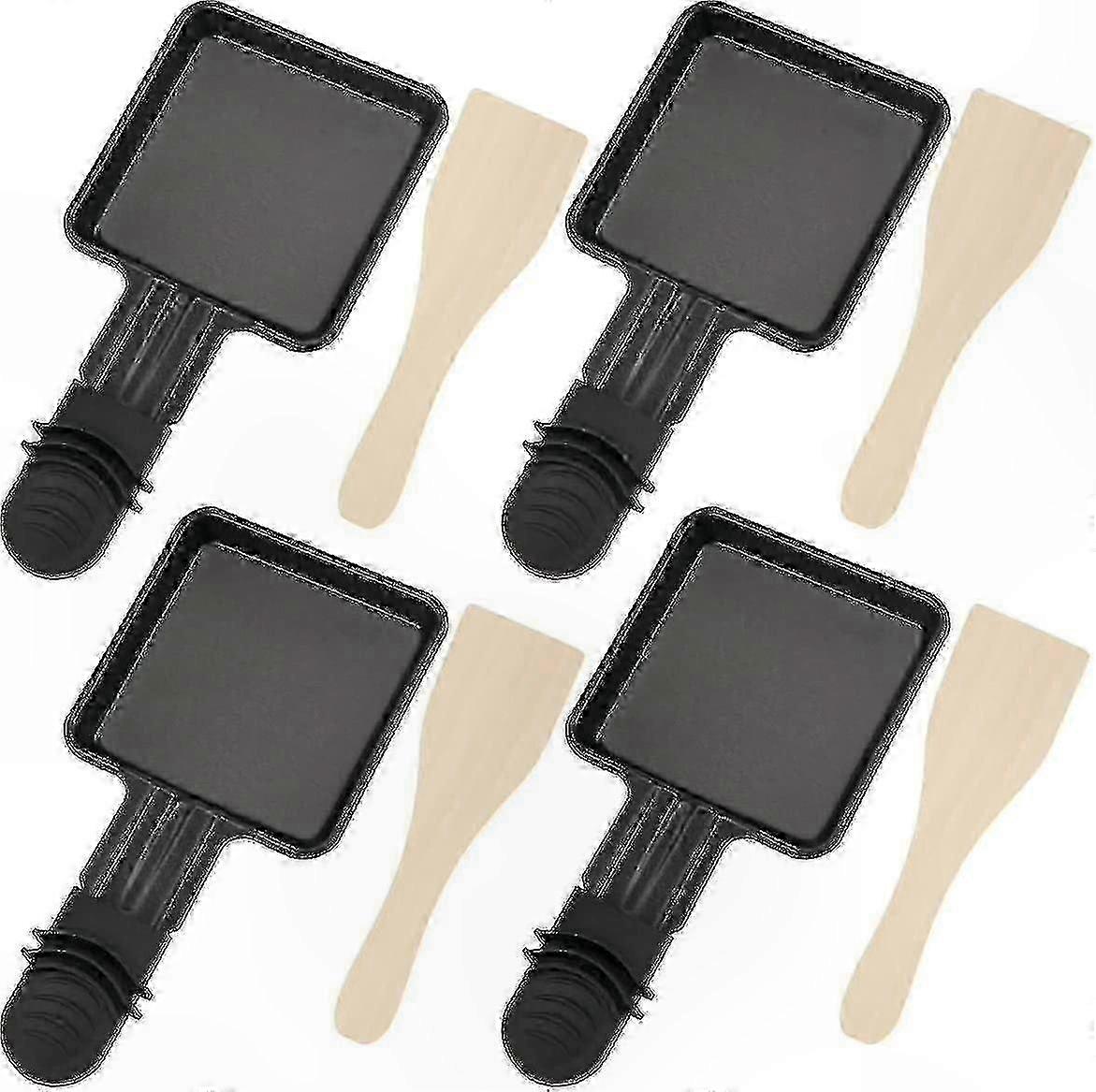 4pcs Raclette Grill Pan with 4pcs Wooden Spatulas, Non-Stick Cast Iron Mini Plates, Heat-Resistant Handle for Safe Handling. High-Quality Material, Durable and Safe, Non-Stick Coating. Wooden Spatulas Protect Your Cookware from Scratches. Ideal for Barbecue and Raclette Cooking.