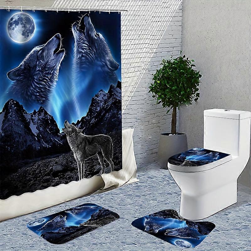 4-Piece Wolf Pattern Bathroom Set - Durable Waterproof Shower Curtain with 12 Hooks, Non-Slip Bath Rug, Toilet Seat Cover, and U-Shape Mat - Complete