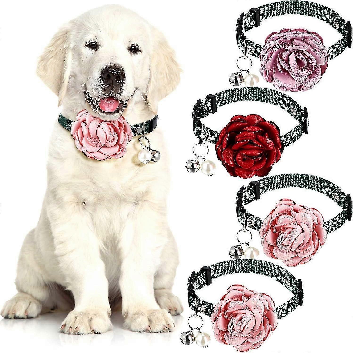 4 Pieces Pet Rose Cat Collar Dog Flower Nylon Adjustable Necklace with Bell and Pearl Pet