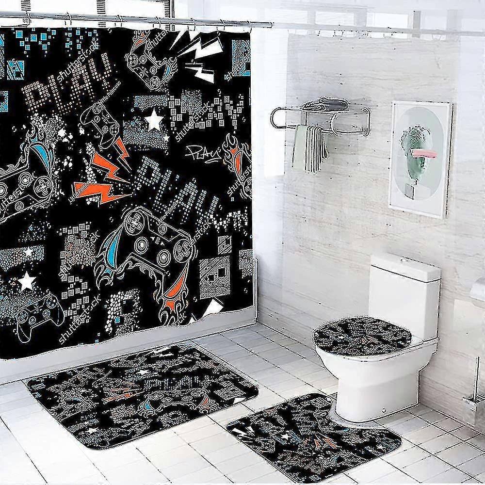 4 Piece Boy Gamer Theme Shower Curtain Set Hippie Black Video Game Shower Curtain Bathroom Anti-slip Mat Toilet Cover Carpet Set( Color : Picture 2 )