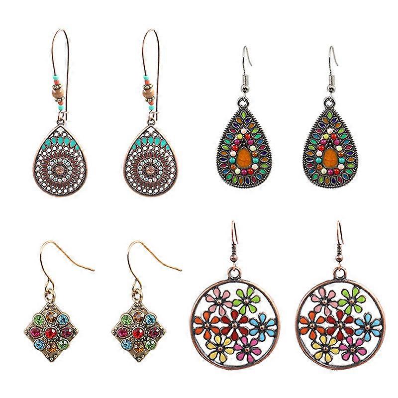 4 Pairs Vintage Dangle Earrings, Women Bohemian Dangle Vintage Drop Earrings Drop Dangle Hook Earrings Boho Pendant Retro Rhinestone Stud Earrings for