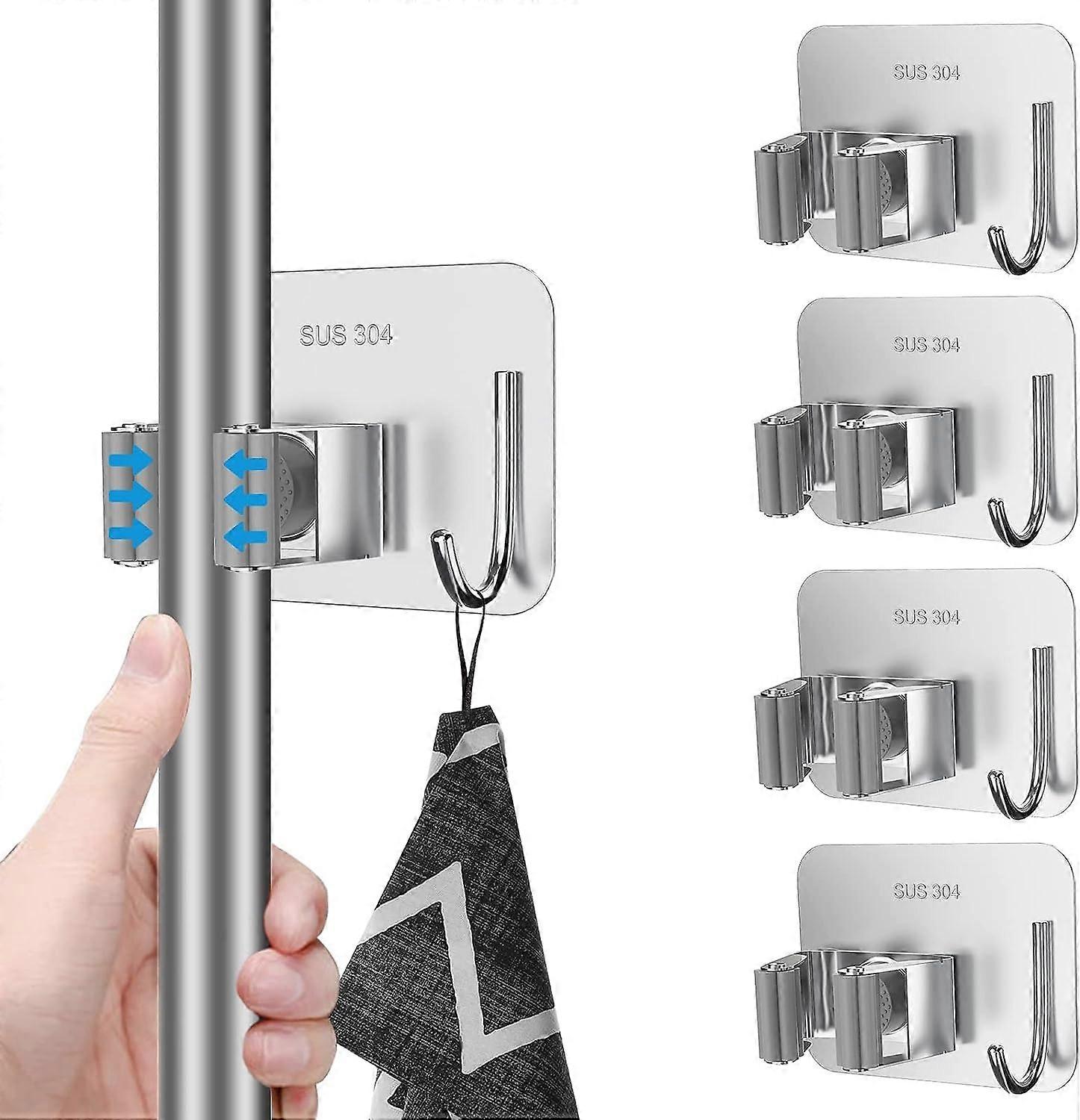 4 mop and broom holders (grey), stainless steel no-drill mop holder wall mounted with hook pendant, mop and broom organiser for bathroom, office, kitc