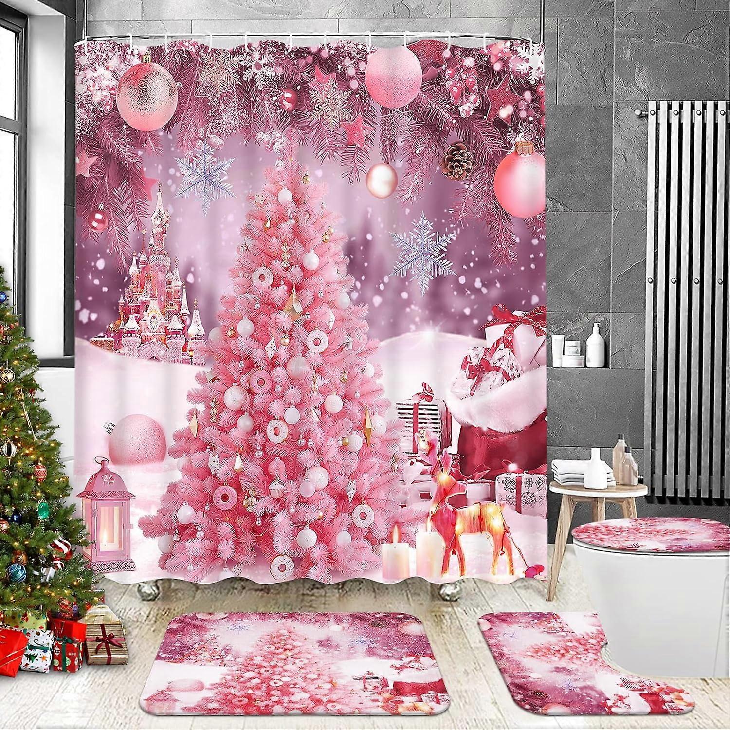 4 Pcs Christmas Shower Curtain Set with Non-Slip Rugs, Toilet Cover & Bath Mat, Snowflake Design, Pink Holiday Bathroom Set