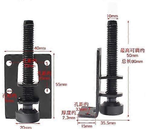 Description These heavy-duty adjustable furniture leveling feet are designed to provide stability and support for cabinets, tables, and chairs. Featuring a sleek right-angle design, they are crafted to blend with various furniture styles while making a practical feetfor uneven floors or surfaces. Features -Color:Black -Material:PVC, steel -Size:8.50X4.00X3.30cm/3.34X1.57X1.30in -Heavy duty design: built to support heavy furniture, these adjustable feet make stability and protect your floors during furniture movement -Antislip material: enhanced friction prevents furniture from sliding on smooth surfaces, making household safety -Rightangle adjustable: adaptable to various furniture bases, these feet allow flexible height adjustments for leveled furniture -Sturdy support: elevate your furniture for easier cleaning underneath, maintaining a tidy living environment -Sidemount design: installation ideal for narrow or corner furniture placements, optimizing space utilizationPackage list: 4 x furniture adjustment foot pads