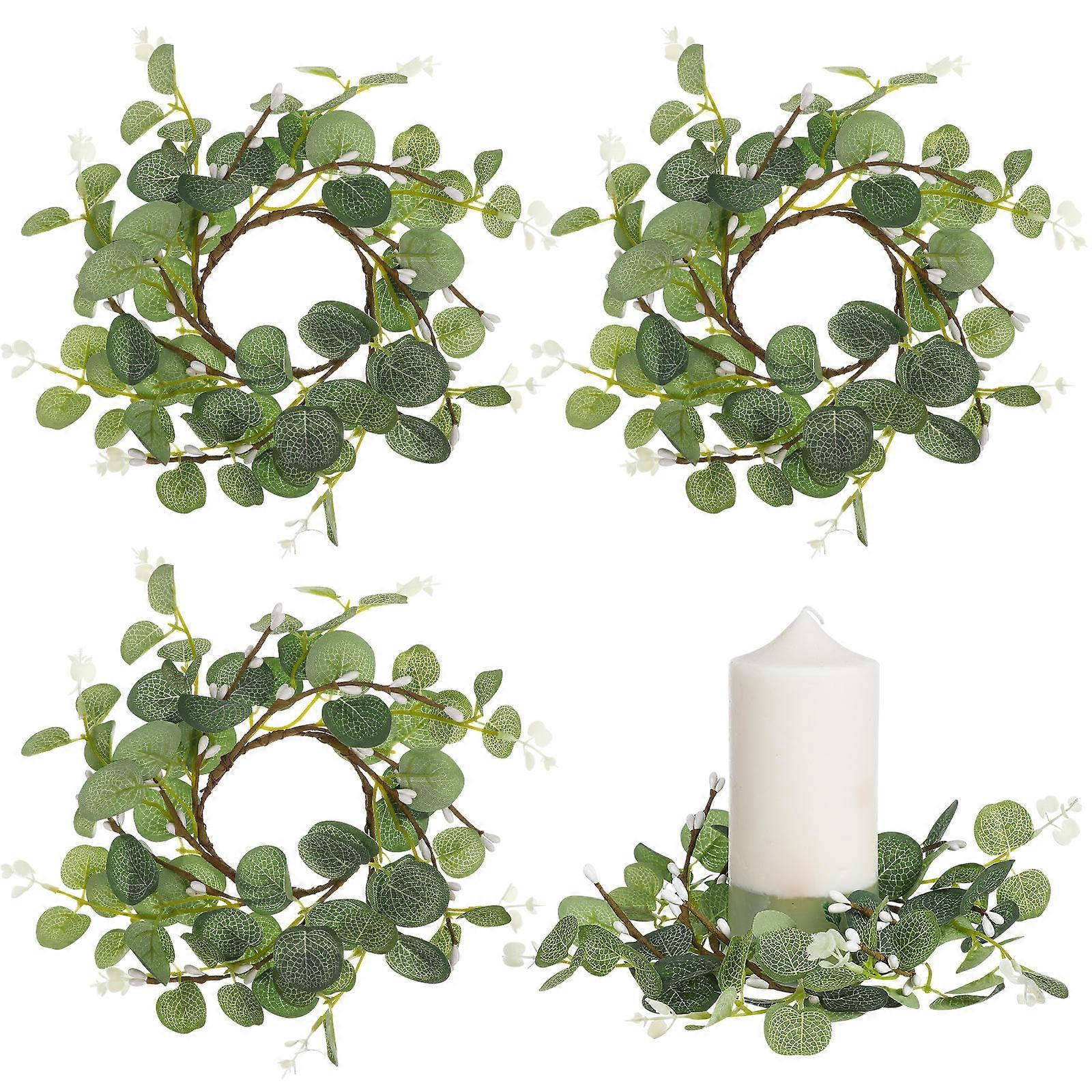 4pcs Eucalyptus Candle Rings, Small Faux Wreaths for Spring Decor, Elegant Greenery Candle Holders for Home, Party & Gift Giving, Realistic Leaves