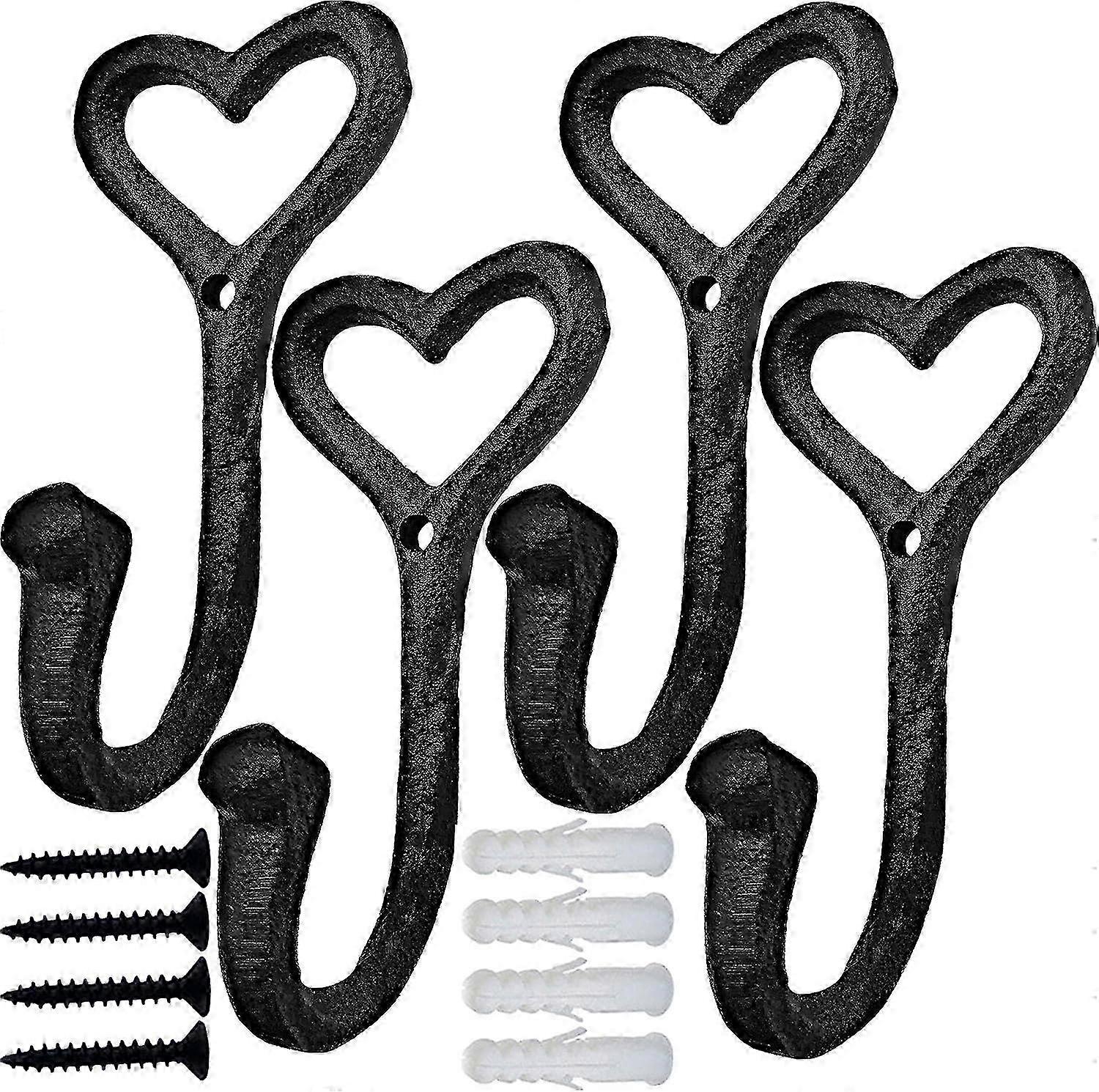 4pcs Black Cast Iron Heart Shape Heavy Duty Wall Hooks for Hanging Coats, Scarves, Bags & More