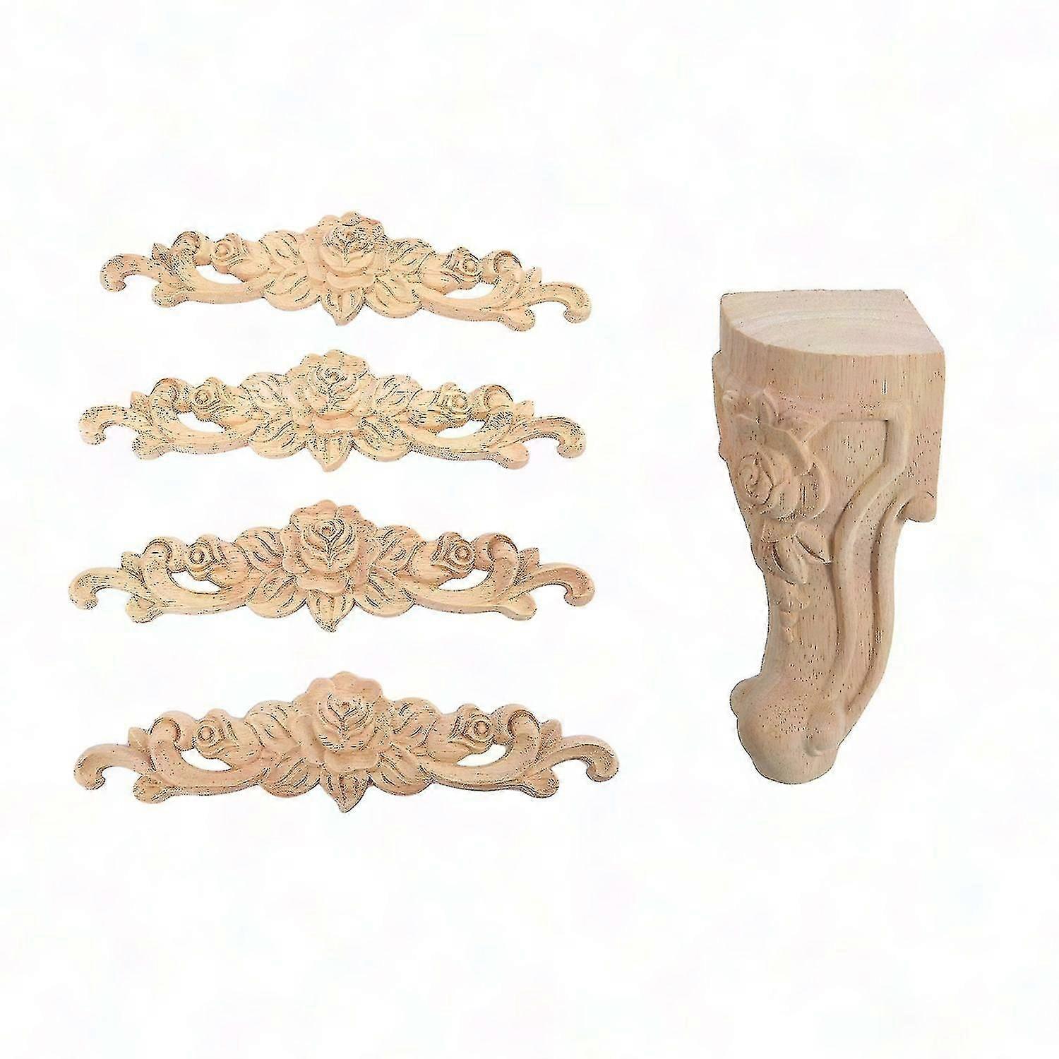 4pcs 20x5cm Rubber Wood Carved Long Onlay Applique & 4pcs 10x6cm Wood Carved Fur Unpainted Flower Decor