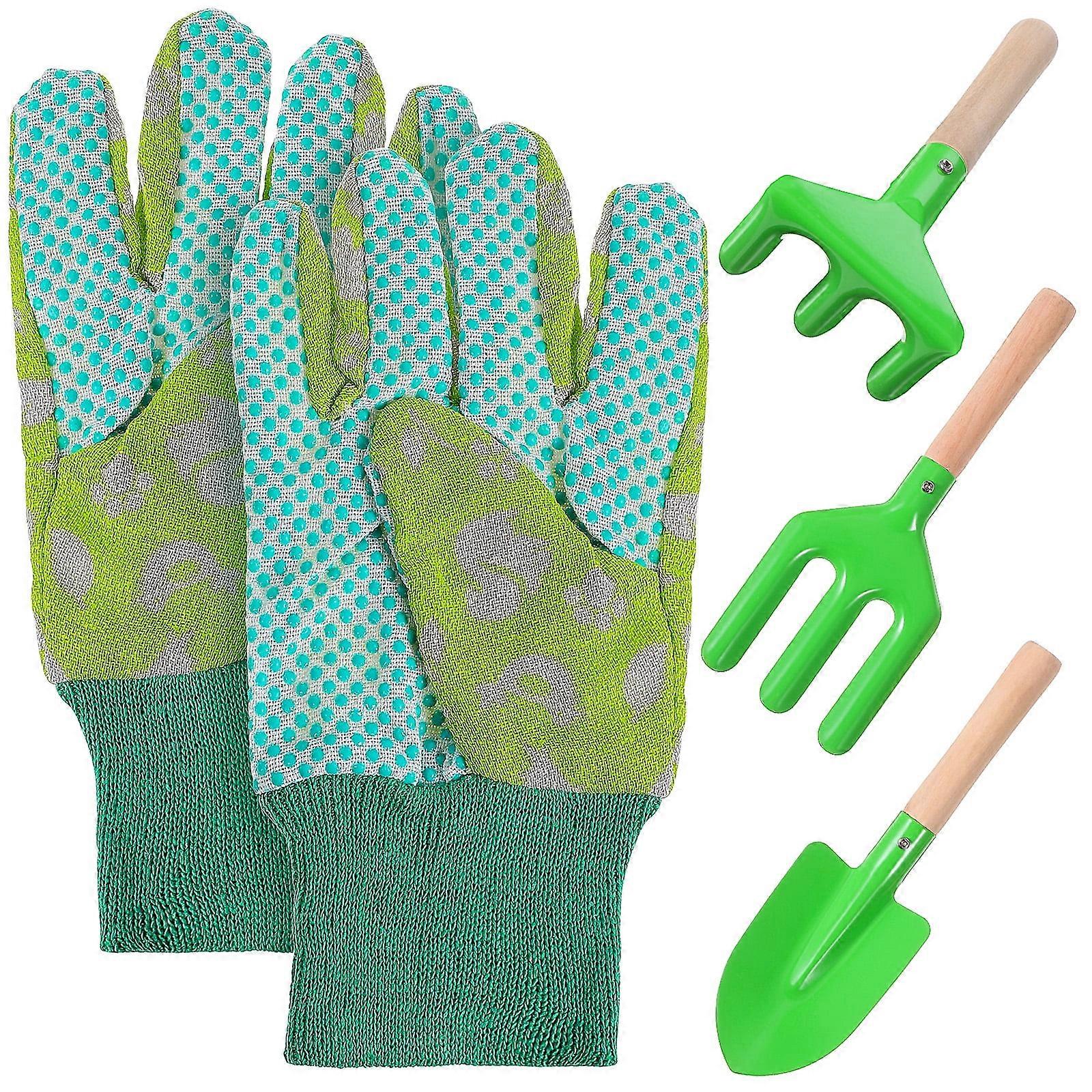 4Pcs/Set Kids Gardening Tool Kit Wooden Handle Garden Tools Includes Shovel Fork Rake and Gloves