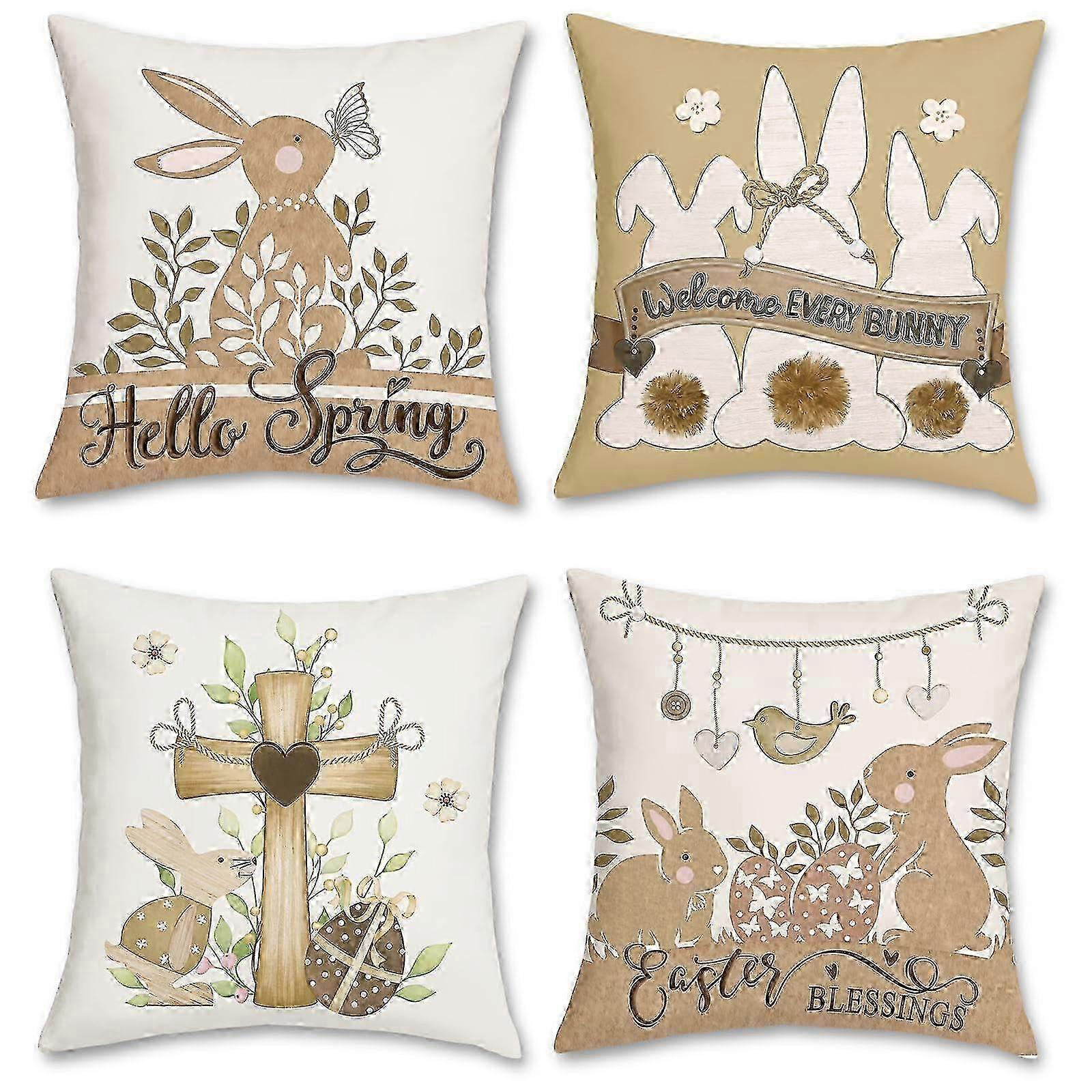 4 Pillow Covers Velvet Easter Bunny & Egg Design for Spring Decor 18x18 Inch