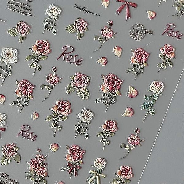 4 Sheets Retro Floral Nail Stickers 5D Embossed Luxury Nail Decals Spring Colored Rose Flowers Nail Design White Flowers Nail