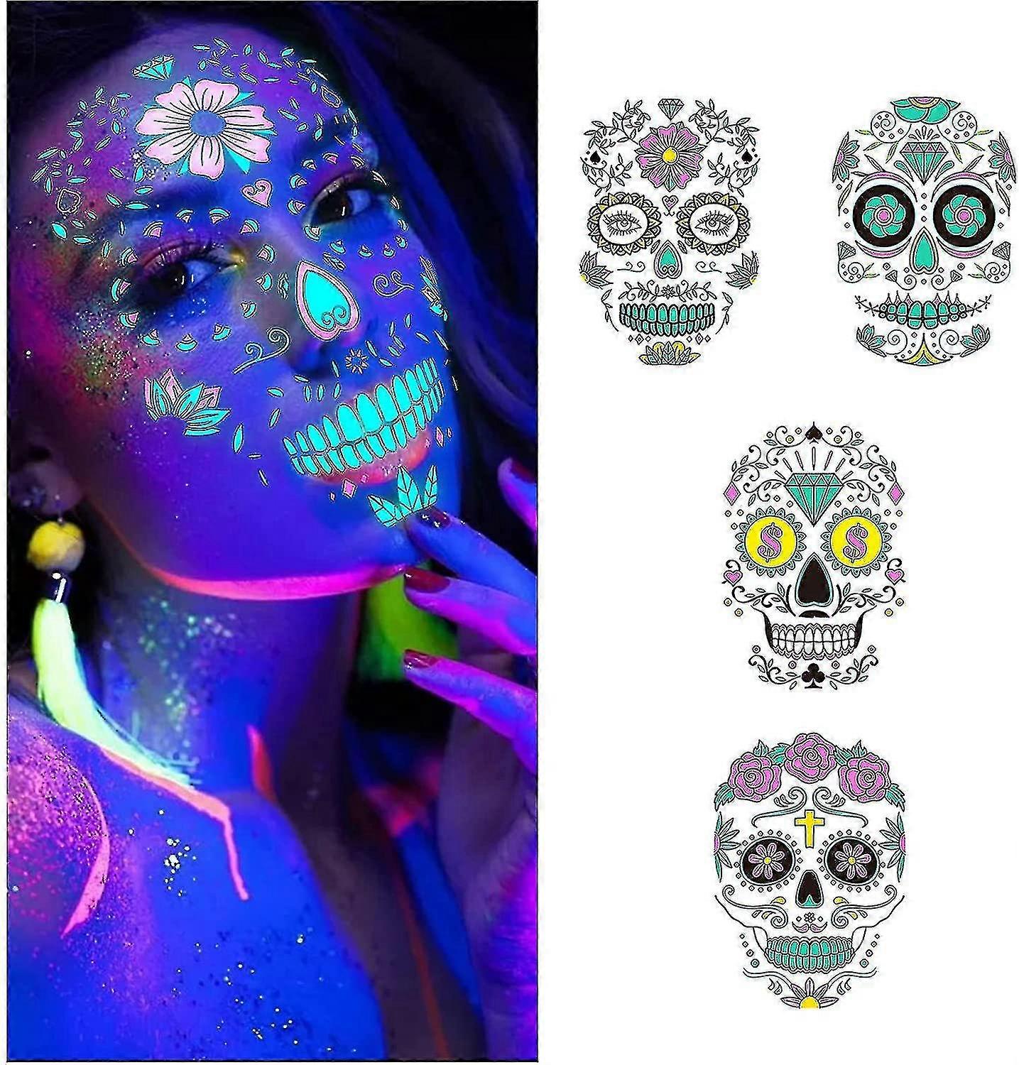 4 Sheets Luminous Face Tattoos, Temporary Face Sticker Fluorescence Makeup Tattoos Stickers For Halloween Cosplay Party