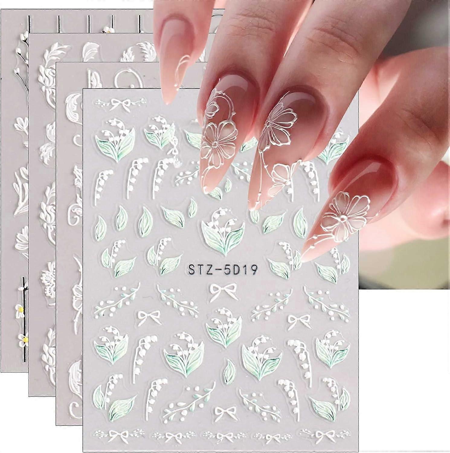 4 Sheets 3D Embossed Feather Floral Nail Art Decals Self Adhesive 5D Colorful Summer Flowers