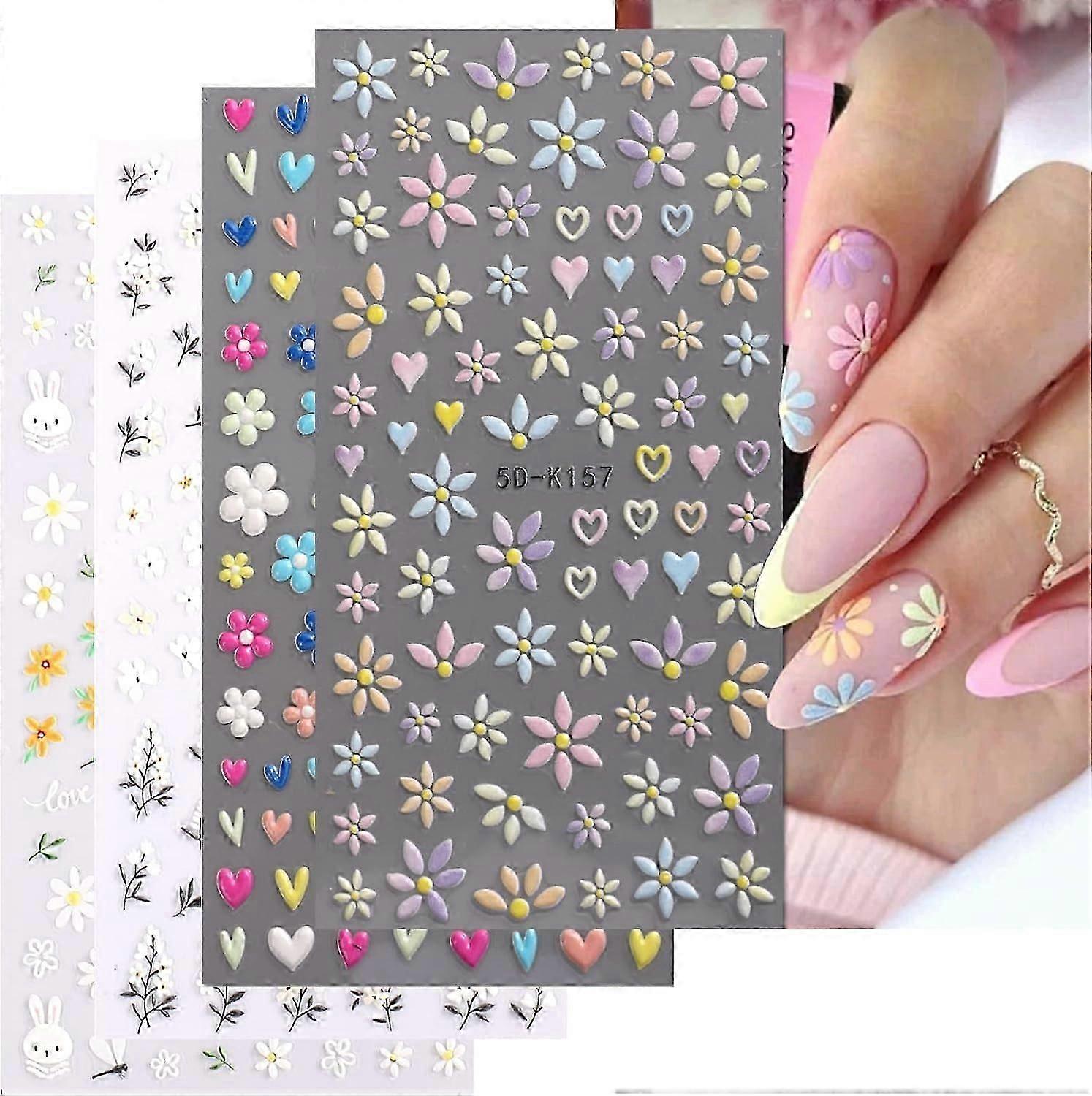 4 Sheets 5D Embossed Nail Stickers Self Adhesive Colorful Blossom Floral Nail Stickers for Nail Art Design Decoration Accessories Spring Nail Stickers
