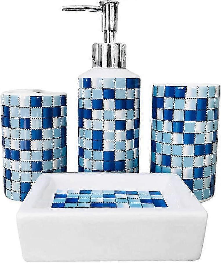 4-Piece Ceramic Bathroom Set - Soap Dispenser, Toothbrush Holder, Cup & Dish - Blue Mosaic