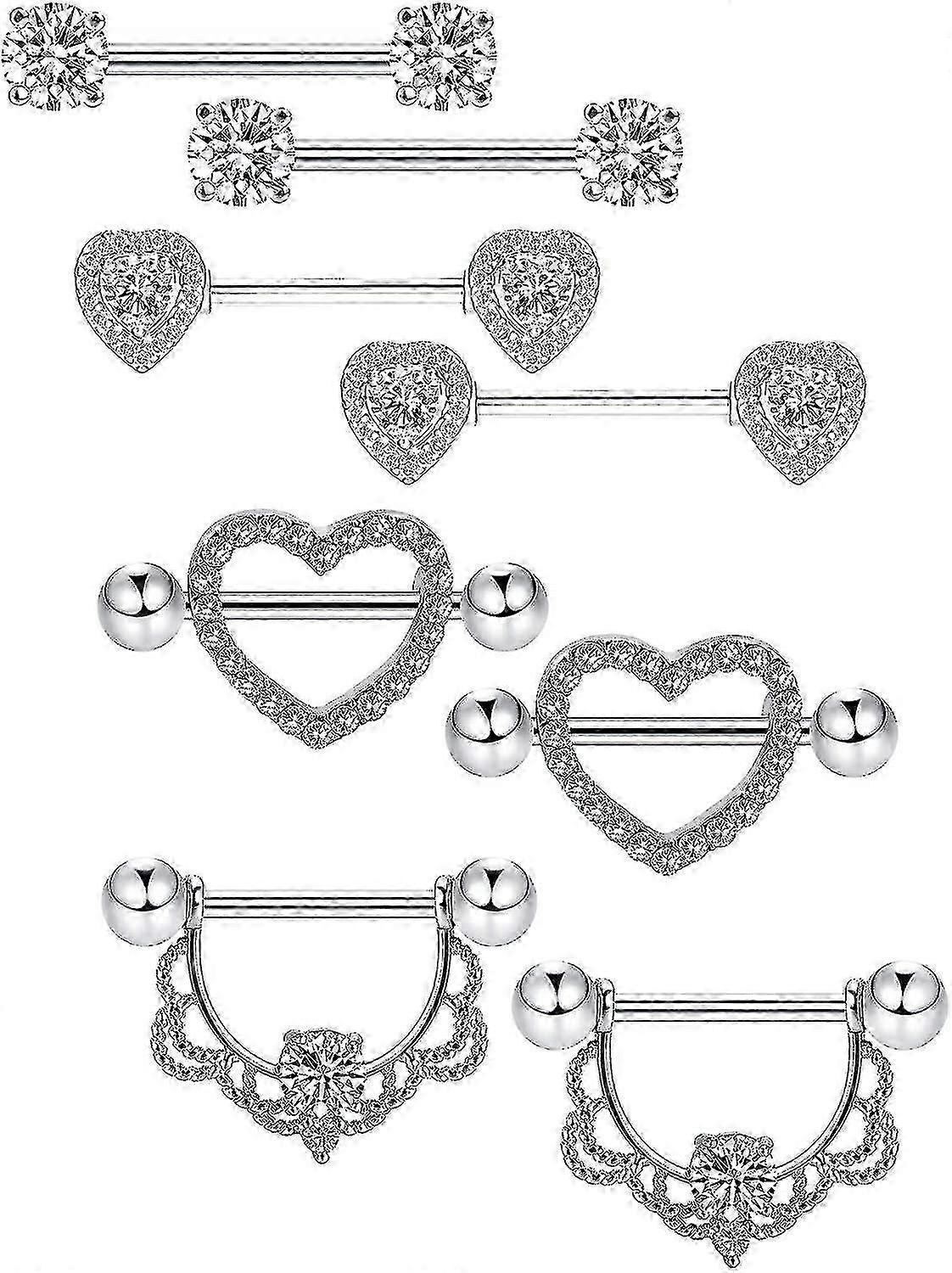 4 Pairs Stainless Steel Nipple Rings Tongue Ring Piercing Body Jewelry Barbell Cz Heart Shape Rings For Women Girls