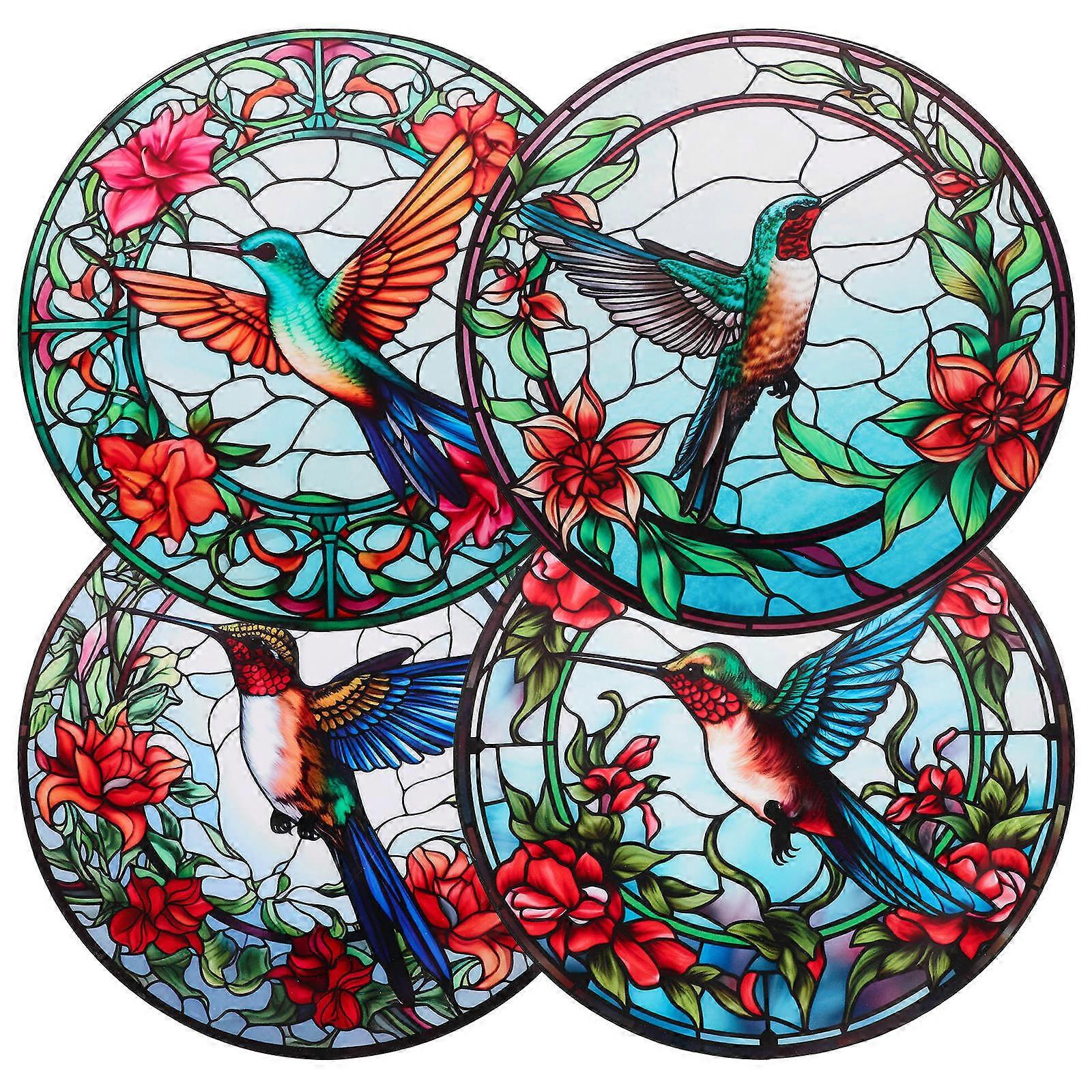 4 Sheets Hummingbird Round Stained Glass Window Clings Anti Collision Decorative Decals for Glass Windows and Doors Non Adhesive Privacy Vinyl