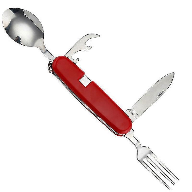 Features: It is 4-in-1 multi-purpose tool, which can meets your various requirement. Made of premium stainless steel and plastic, wear resistant and durable. Multifunction use, a practical outdoor survival tool for hunting, hiking and so on. It can be used as fork, spoon and knife. Well-polished, no shape edges, safe to use. Description: It's also nice gift for relatives and friends. An nessary tool for you to survive at outdoors. Compact size, portable, easy to carry, space saving. Specifications: Material: plastic+stainless steel/stainless steel Color: red Folded Length: 90*20mm