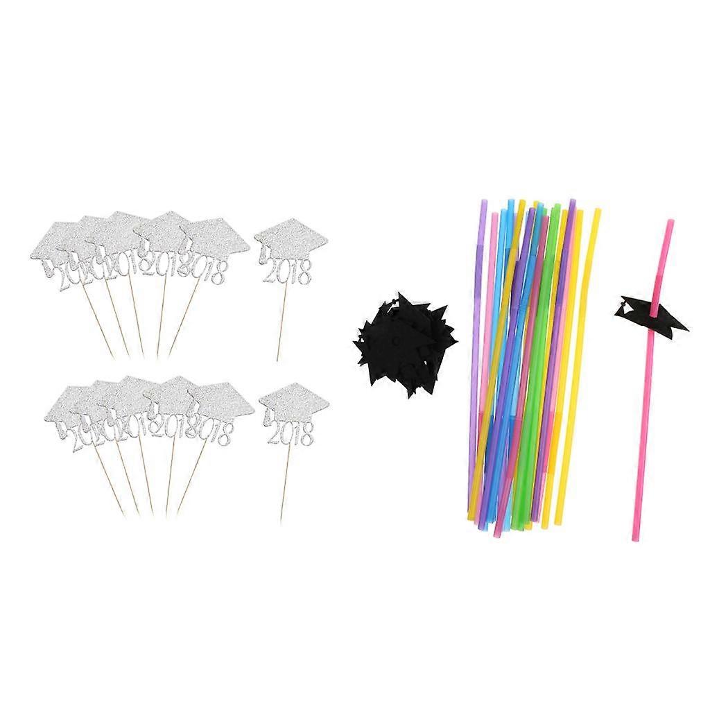 40pcs Set Graduation Party Cupcake Toppers and Grad Drinking Straws Decor
