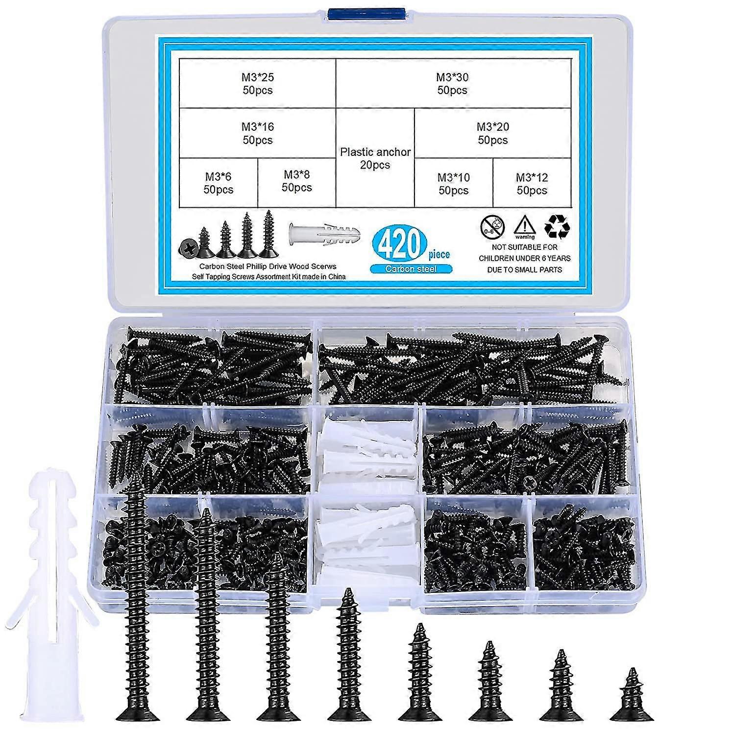 420 Pcs M3 Self Tapping Wood Screws Assortment Kit, Black Flat Head Wood Screws Fasteners Kit, Phillips Drive Countersunk Head Cabinet Drywall Screws