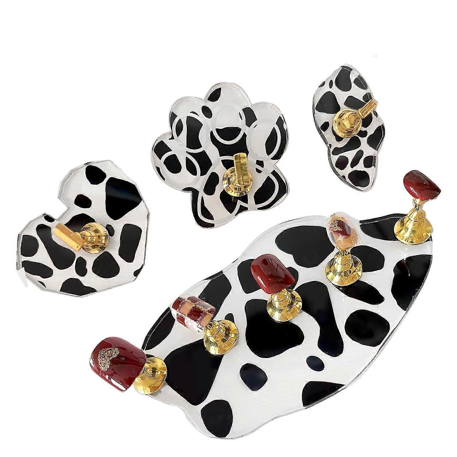 4pcs Cow Print Magnetic Nail Tip Display Work Stand Set With Basic Acrylic - Press On Nail Tools - Nail Art Practice Holder