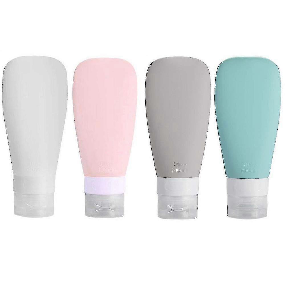 Leak proof squeezable refillable travel accessories toiletries containers travel size cosmetic tube for shampoo lotion soap liquids (4pack)portable travel size silicone bottles are perfect for travel, gym and business trip. LEAK PROOF \u0026 SQUEEZABLE - The silicone toiletry bottles are designed leakproof, so no liquids will be leaked in the suitcase during your travel, the flexible silicone brings convenience, you will get no waste when squeeze it. SAFE MATERIAL - This carry-on approved set of refillable travel bottles are made of soft and durable silicone, all are BPA free, so you can take your favourite toiletries along with you on the plane. EASY TO REFILL \u0026 CLEAN - The cap of the travel bottle can be completely removed from the silicone for easy cleaning, and the opening is wide enough for easy filling and dispensing. Material: Silicone Capacity: 60ml\/ pc Package list: 4 x Silicone Travel Bottles(Pink, White, Light blue, Grey) 1 x PVC Bag