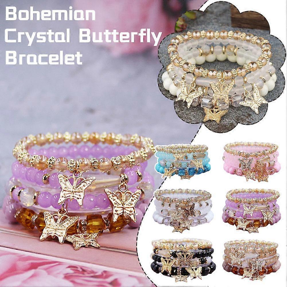 4PCS Trendy Butterfly Beaded Bracelet Set For Women Acrylic Beads Elastic Chain