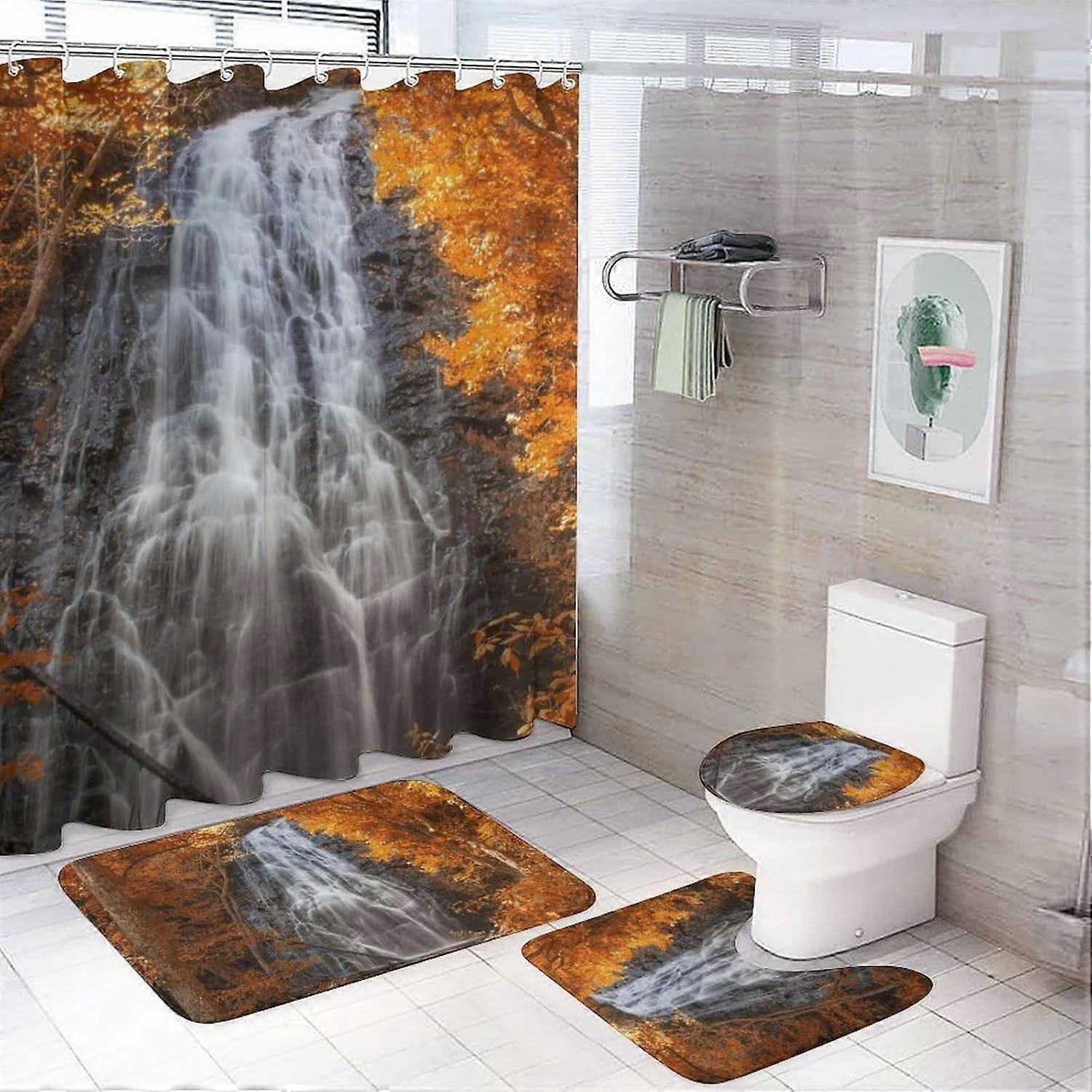 4PCS Fall Waterfall Shower Curtain Set with Rugs & Accessories, Non-Slip Bath Mat, Toilet Lid Cover, 71"x71" Waterproof Curtains for Family Hotel Use