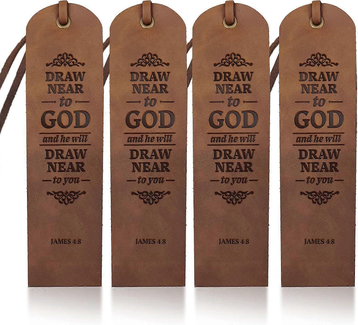4pcs Leather Bible Bookmarks 27inch Christian Bookmarks Cowhide Draw Near to God Text Bible Verse Leather Page Markers Gift for Men Women Book Reading