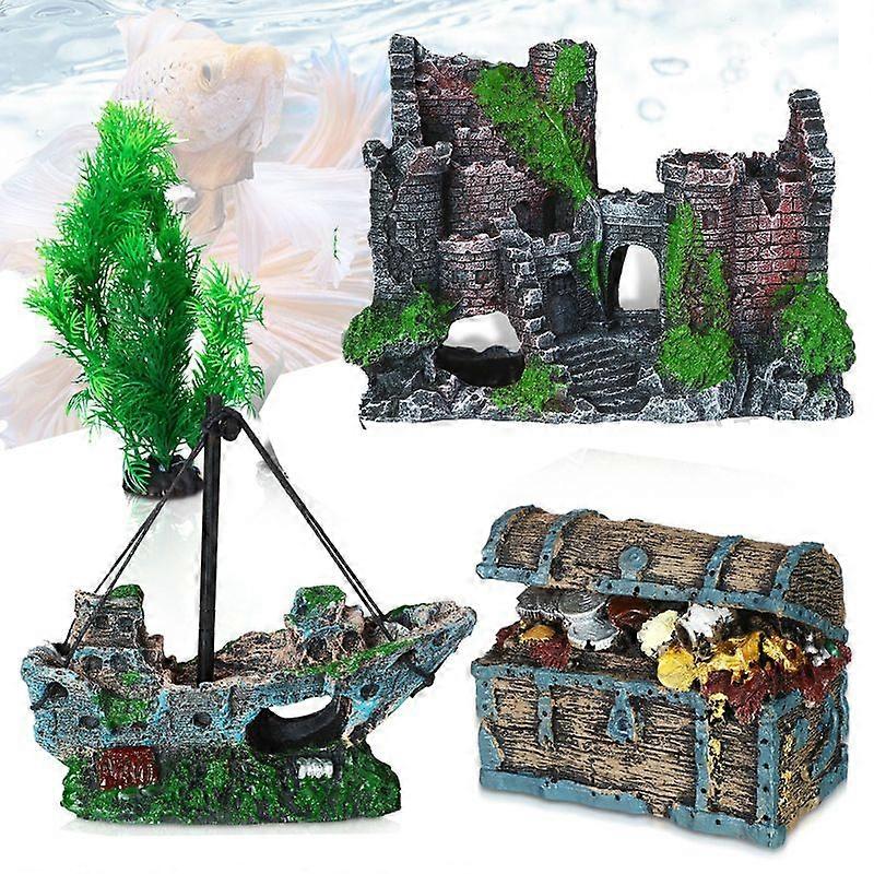 4pcs Aquarium Castle And Shipwreck Decoration Realistic Artificial Plants Resin Treasure Chest Fish Shrimp Hideout Cave Fish Tank Ornaments Decor
