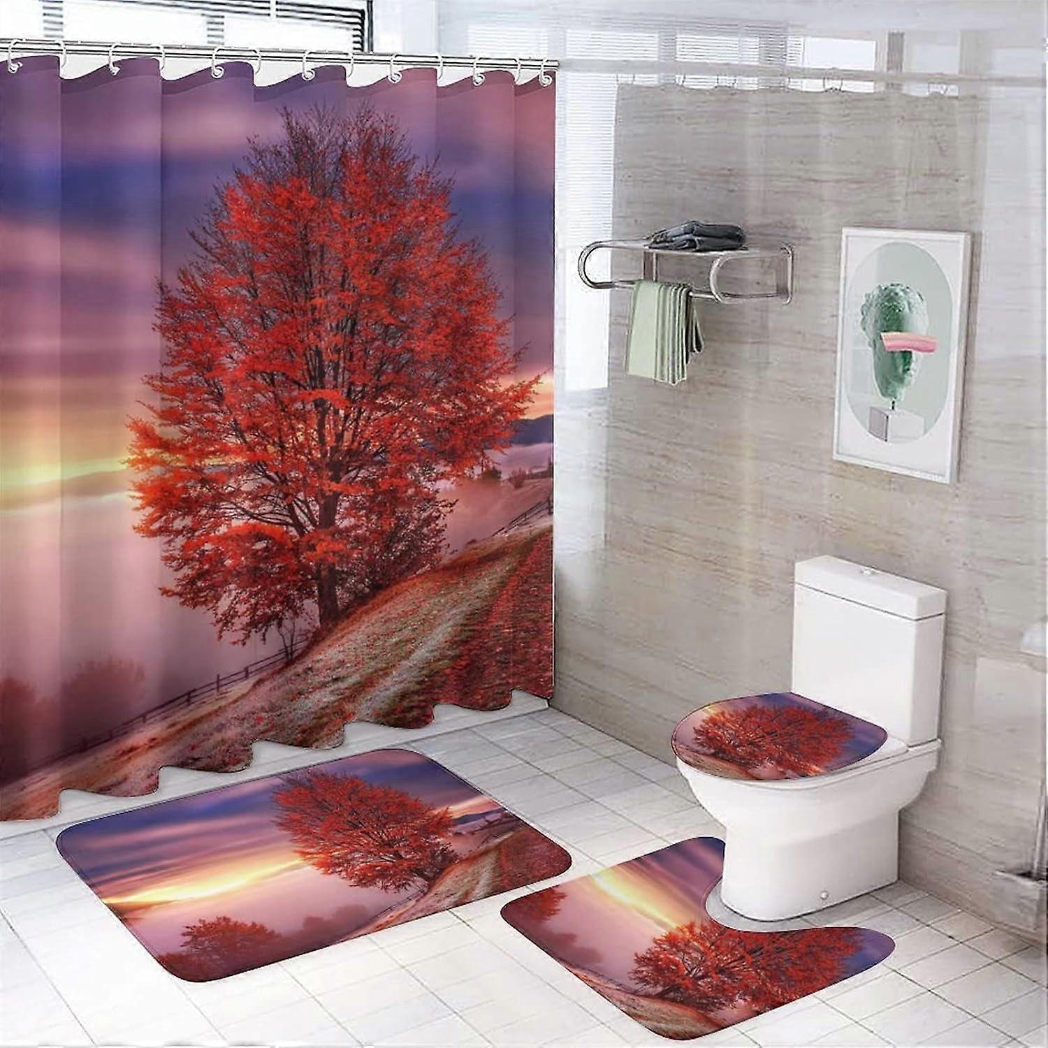 4PCS Elk Forest Shower Curtain Sets with Non-Slip Rugs, Toilet Cover & Bath Mat, Fall Scenery Waterproof Polyester Curtains for Bathroom (12 Hooks)
