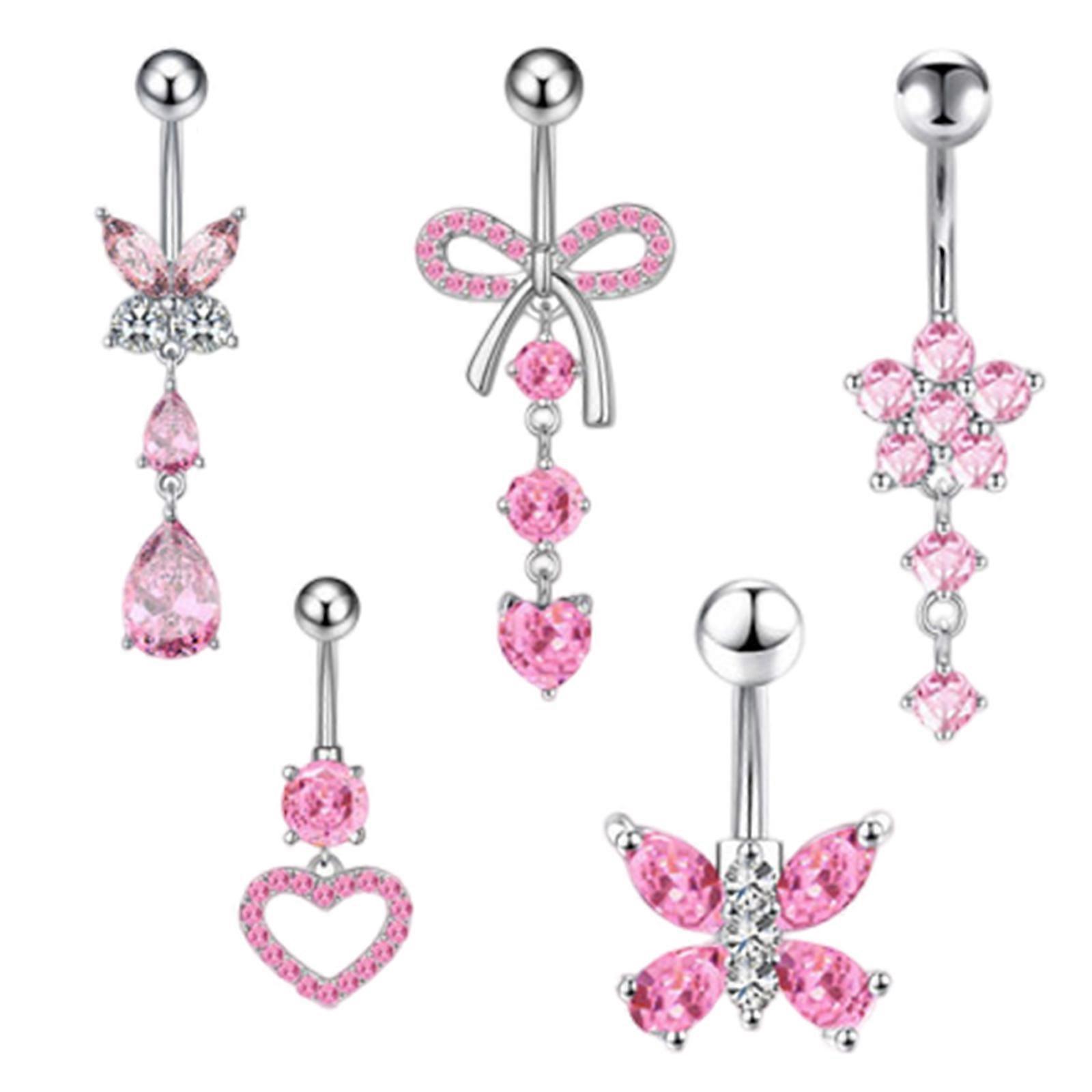 5 pink belly button rings, hypoallergenic belly button ring, dangling belly button ring, heart shaped belly button ring