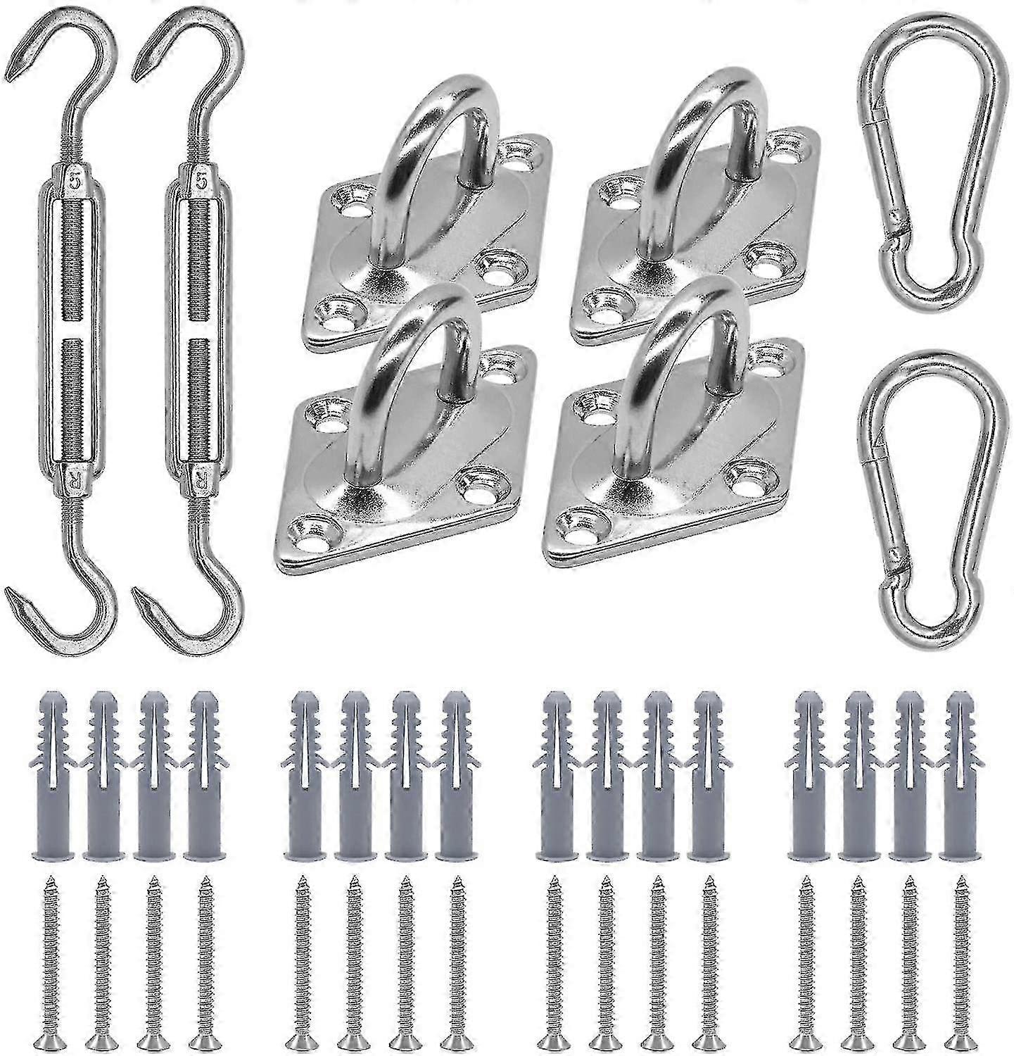 Sun Shade Sails Hardware Kit For Square/rectangle/triangle Shade Sail, 5 Inch Stainless Steel Anti-rust Installation Hardware Kit For Outdoor Patio Ga FG05 Size 40 PCS Material Plastic, Metal Package Includes: 2 x Adjustable Turnbuckle 2 x Snap Hook< /p> 4 x Pad Eye 16 x Plastic Expansion 16 x Screw About this item High Quality MaterialSun shade sail hardware kit is made of 304 stainless steel, which is durable, heavy duty and anti-rust. They can load your shade sail firmly and keep sturdy for many years. It is an ideal choice for shade sail installation. Lengthened Screw and ExpansionOur screws and plastic expansions for shade sail are specially lengthened. The screw is 1.49 long and the expansion is 1.37 long, which is longer than others' (screw: 1.18, expansion: 1.14). Longer screw and extension will make the pad eye attached to the wall more firmly. It prevents the shade sail from being blow away or falling off in wind. Adjustable TurnbuckleThe adjustable turnbuckle is used to tight the shade sail. You can adjust the distance between pad eye and shade sail by simply twisting the turnbuckle until the shade sail is with full tension. Complete Hardware KitSail shade hardware kit includes complete accessories for sun shade sail installation. You can get Adjust Turnbuckle x 2, Snap Hook x 2, Pad eye x 4, Screw x 16, Plastic Expansion x 16. It is easy for you to install shade sail with our hardware kit. Wide ApplicationOur installation hardware kit is suitable for most square / rectangle / triangle sun shade sails less than 161 sq.ft/15. You can install your shade sail between walls or trees in outdoor patio garden with this hardware kit.