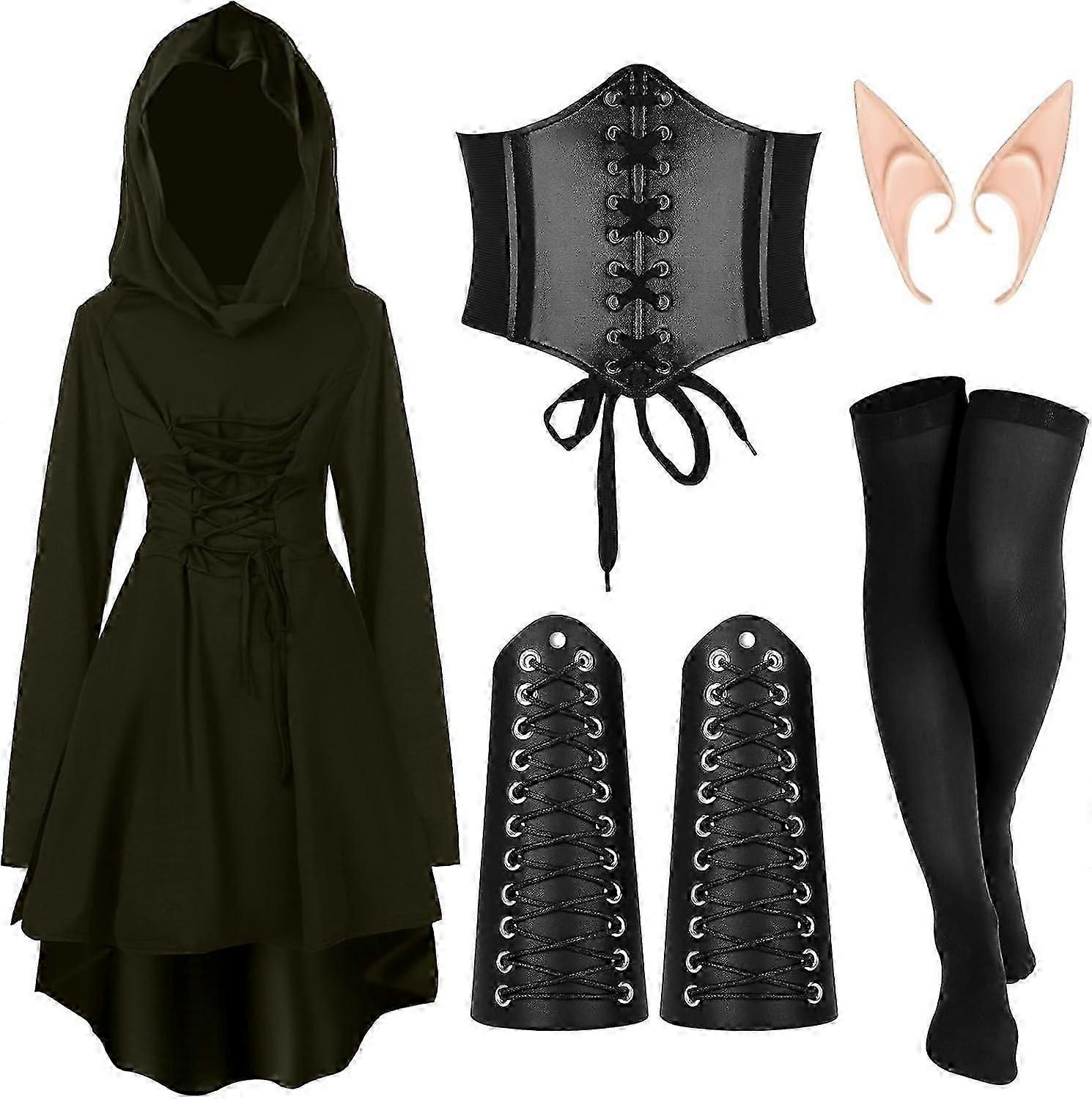 Medieval Retro Costume Set: you will receive 1 army green hooded robe costume, 1 pair of elf ears, 1 elastic black belt, 1 pair of leather gauntlet wristbands, and a pair of stockings, enough for your dress and cosplay party needs