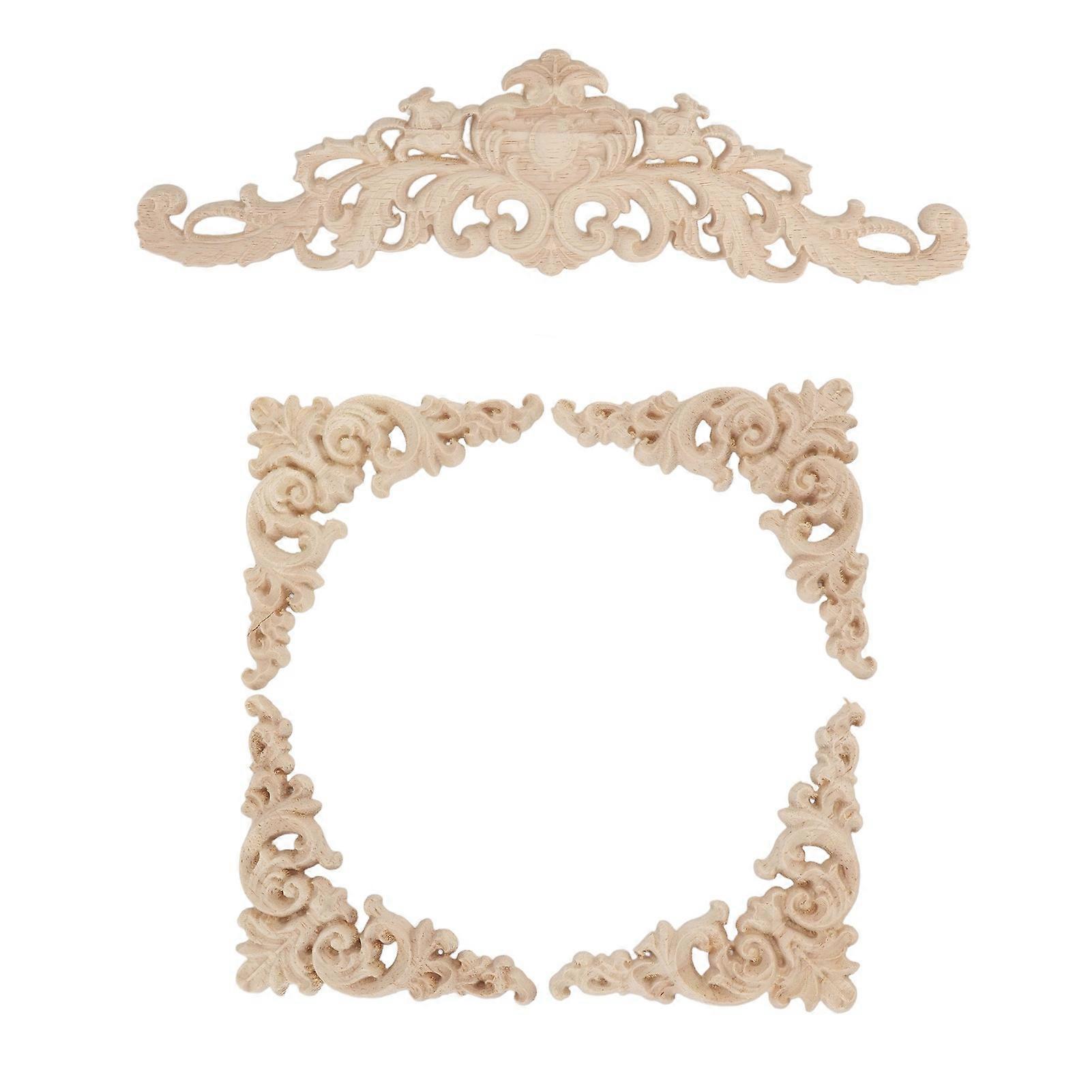 5Pcs Wooden Appliques Onlays Rubber Wood Carved 4 Corner Onlays and 1 Long Onlay for Cabinet Door Bed Wardrobe Furniture