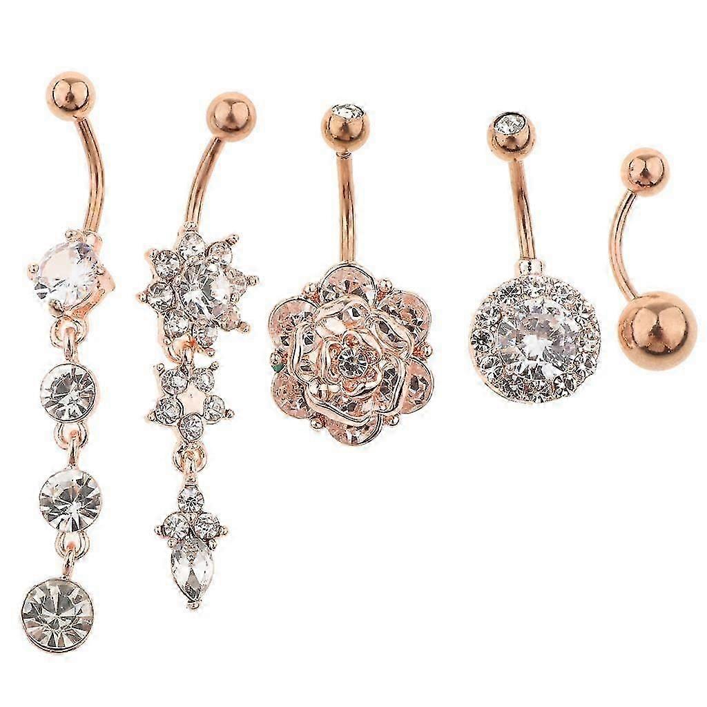 5Pcs Elegant Dangle Belly Ring Rose Gold Crystal Navel Ring Bar Piercing 1.6mm