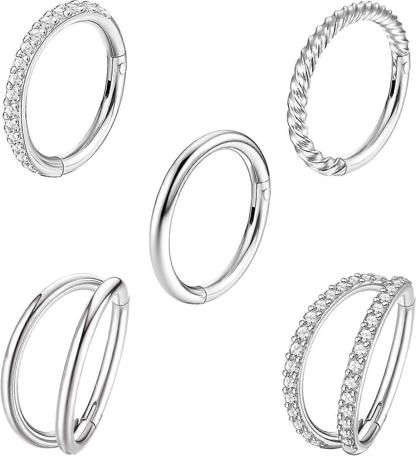 Easy to Use: Hinged segment rings are easy to open and close by hand, no tools required; The closure is seamless; And it's still tight after longterm use, so you don't have to worry about losing them in the shower, while walking or exercising MultiUsage Hoop Piercing: The piercing rings can be used as nose rings hoop, lip rings, cartilage hoop earring, septum rings, rook earrings, daith earrings, tragus earrings, eyebrow piercing, belly piercings, etc; Great choice for daily wear and gifting Satisfactory Service: We promise to provide the best products and the best service to our customers; Ninety days money back and exchange service, our professional aftersales team is online twentyfour hours a day; We strictly inspect our products for mens handsome and womens beauty; And if any needs, please feel free contact us, thank you Hypoallergenic Material: Small nose rings are made of 316L surgical steel, hypoallergenic, lead and nickel free, suitable for sensitive skin; High polished smooth surface, comfortable to wear without sharp edge, you can sleep, work and have a shower with it in due to the snaps closed well and won't fall out Nose Rings Hoops: Ring size: 16 gauge (thickness: 1.2mm), inner diameter 8mm (5/16 inch); One order includes five different styles of silver nose rings, cz nose ring, cz double hoop ring, double nose ring, twisted nose ring and simple nose ring; Please double check the measurements prior to purchasing