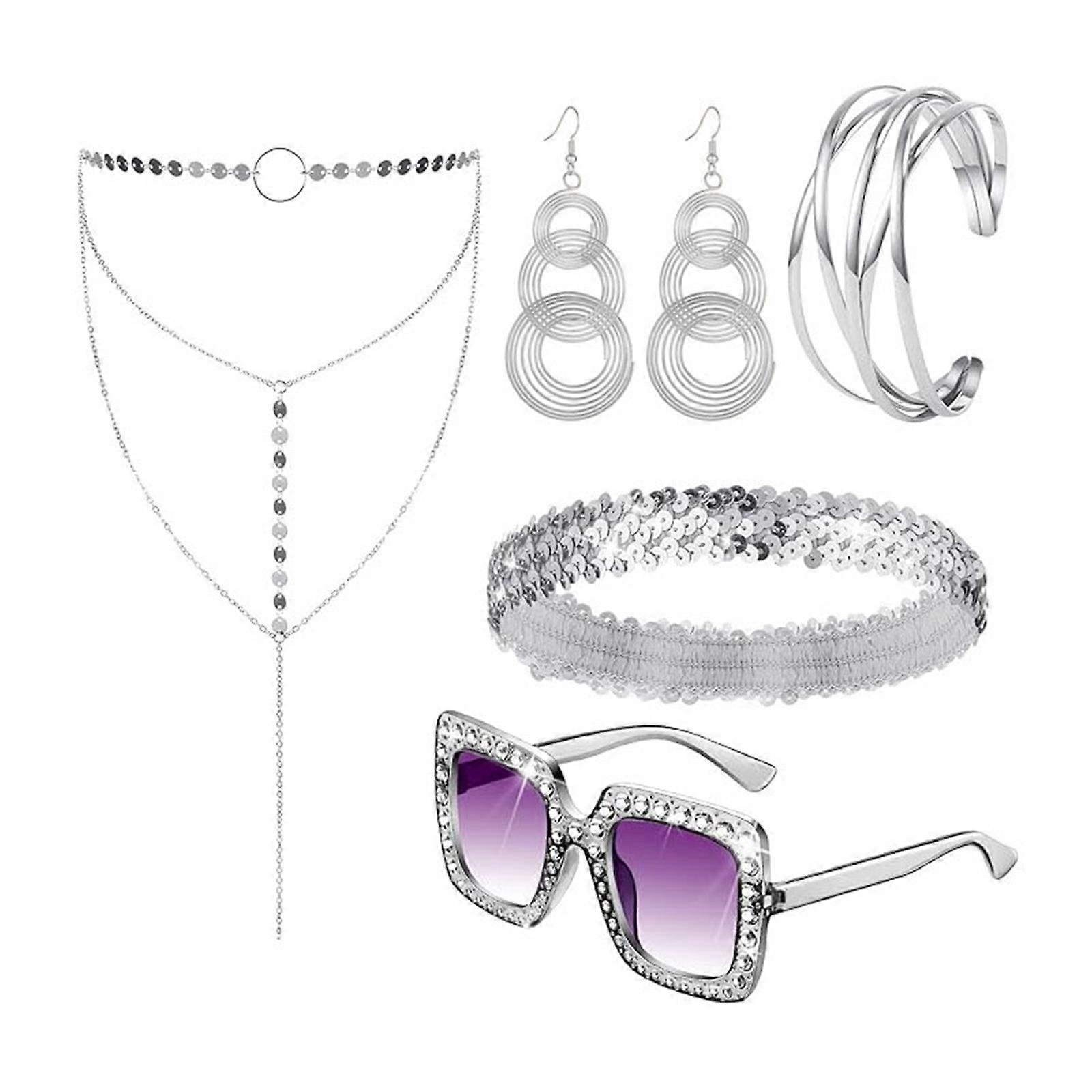 5Pcs 70s Disco Jewelry 1970s Disco Costume Jewelry for Women 70/80s Theme Party Hippie Costume Jewelry Accessory Silver