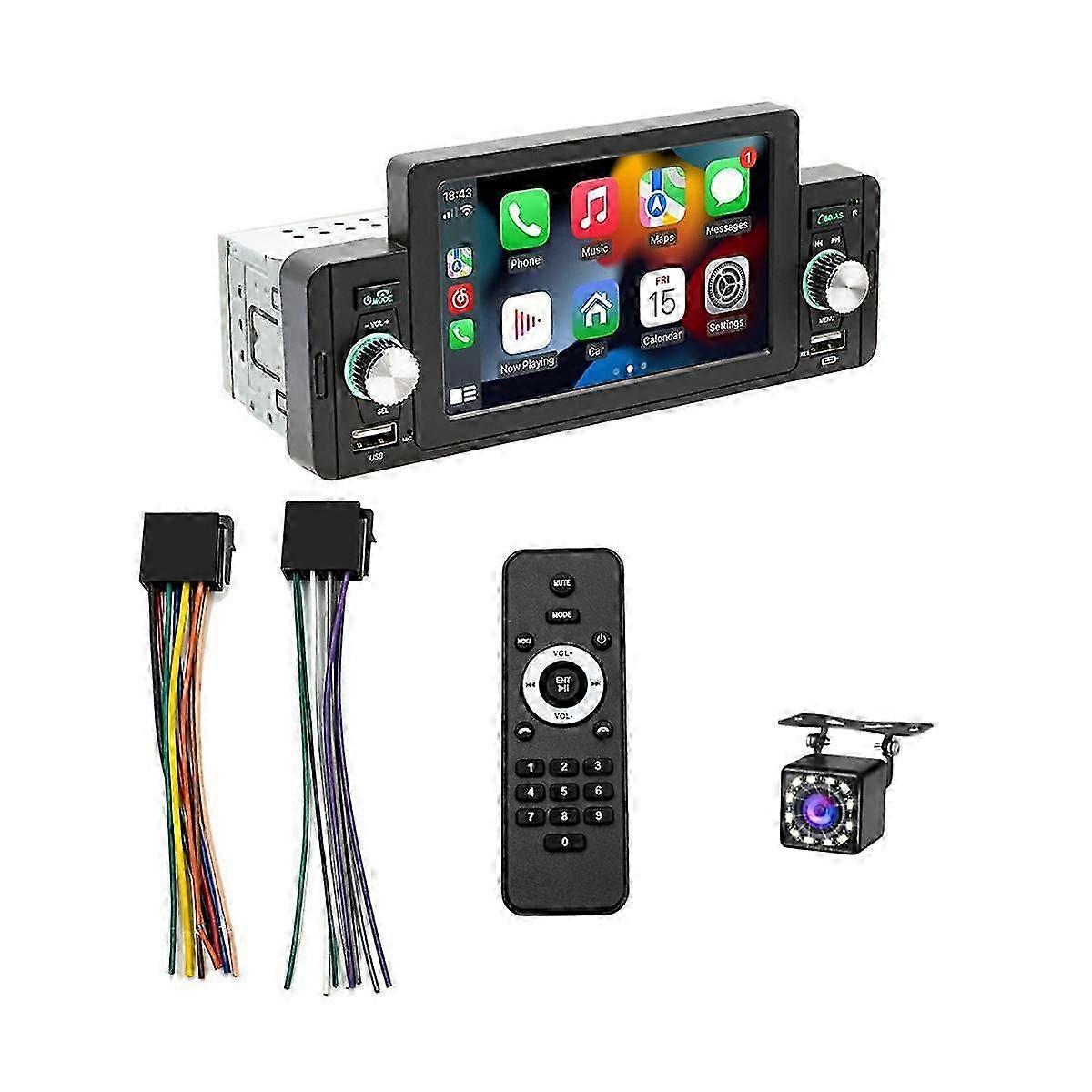 Wireless Carplay & Android Auto: Just connect with your smart phone that possible to access map navigation, phone contacts, email, notification, allowing you to make phone calls, navigate, with the help of Siri or Google voice assistant. Phone Mirror-Link: Support "stereo-phone interconnection" with most cellphones. Through mirror-link, the car stereo will display the content from your cellphone screen synchronously such as maps, , games. Bluetooth 5.1: Wireless audio stream via bluetooth provides a stable connectivity to your smartphone or bluetooth device, brings you a superior music listening experience! Reversing Image Function: Equipped with a unique 12 wick reversing camera, bringing you clearer night vision distance. The 5-inch touchscreen will automatically display the reverse image once you put the car into reverse gear. Make your daily reversing . Product Type: Single Spindle Car MP5 Radio frequency: FM 87.5~108.0MHz Output power: 60Wx4 Working voltage: 12~14.4V Working temperature: -10~60 Bluetooth version: version 5.1 (default name: Carkit) Display resolution: 800x480 Screen size: 5 inches Audio format: MP3/AAC/APE/OGG/M4A/RA/WAV Video format: H263/H264/H265/ HD(720P 1080I 1080P)//MKV/MPEG/MP4/WMV9////QT Picture format: JPEG/PNG/BMP/GIF/ Factory set password: 113266 Language parameters: English, Chinese, French, German, Arabic, Italian, Japanese, Portuguese, Russian, Spanish, Hebrew, Polish, Turkish, Material: ABS colour: black Package Contents: 1 x player 1 x 12-led camera 1 x Camera extension cable 2 cable 1 x Remote control (without 2xAAA batteries) Only the above package content, other products are not included. Note: Light reflection and different displays may cause the color of the item in the picture a little different from the real thing. The measurement allowed error is +/- 1-3cm.