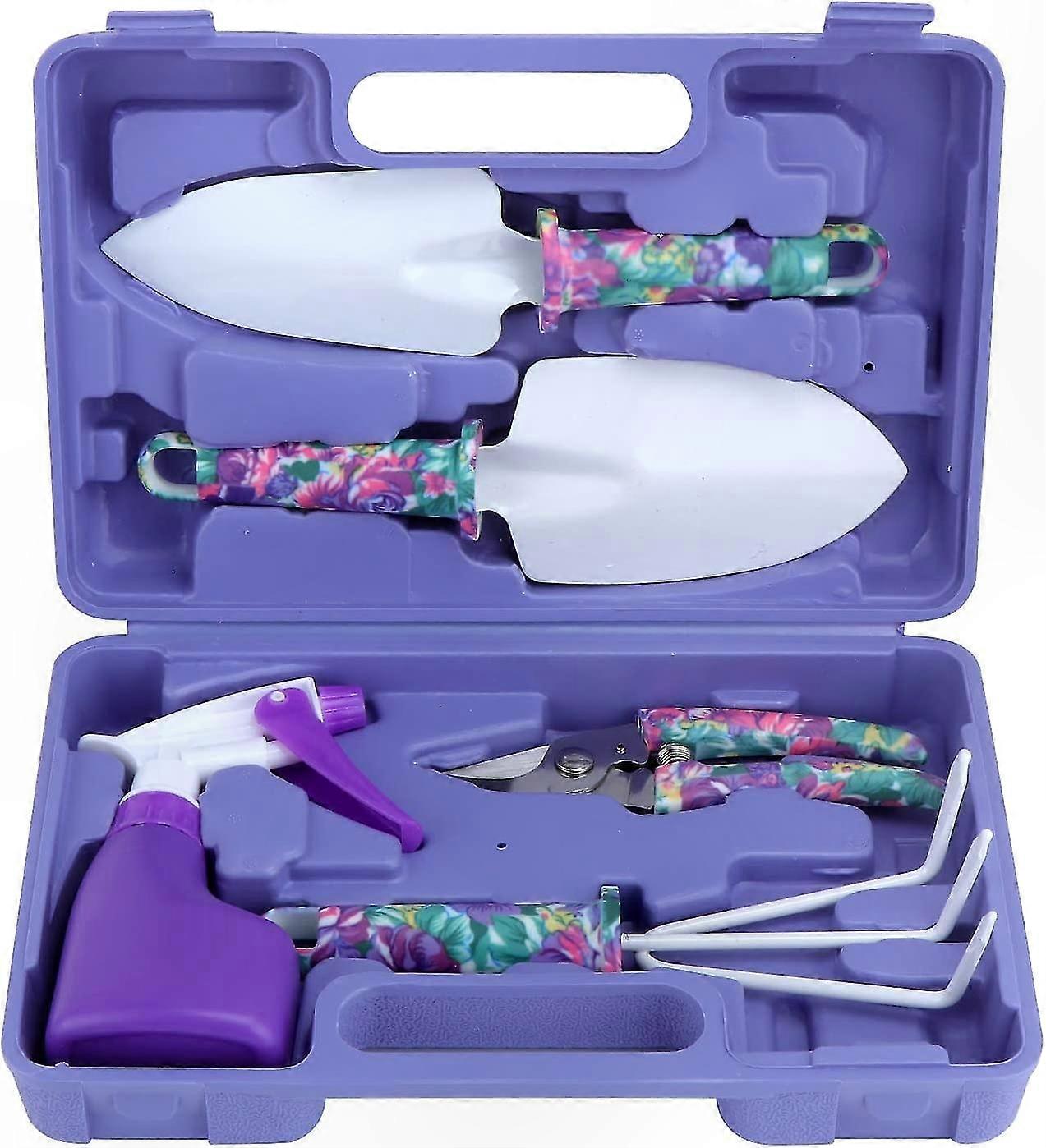 5 Pieces Gardening Tools with Storage Box with Transplanters Scissors Harrow Anti-Rust Sprayer(Purple)