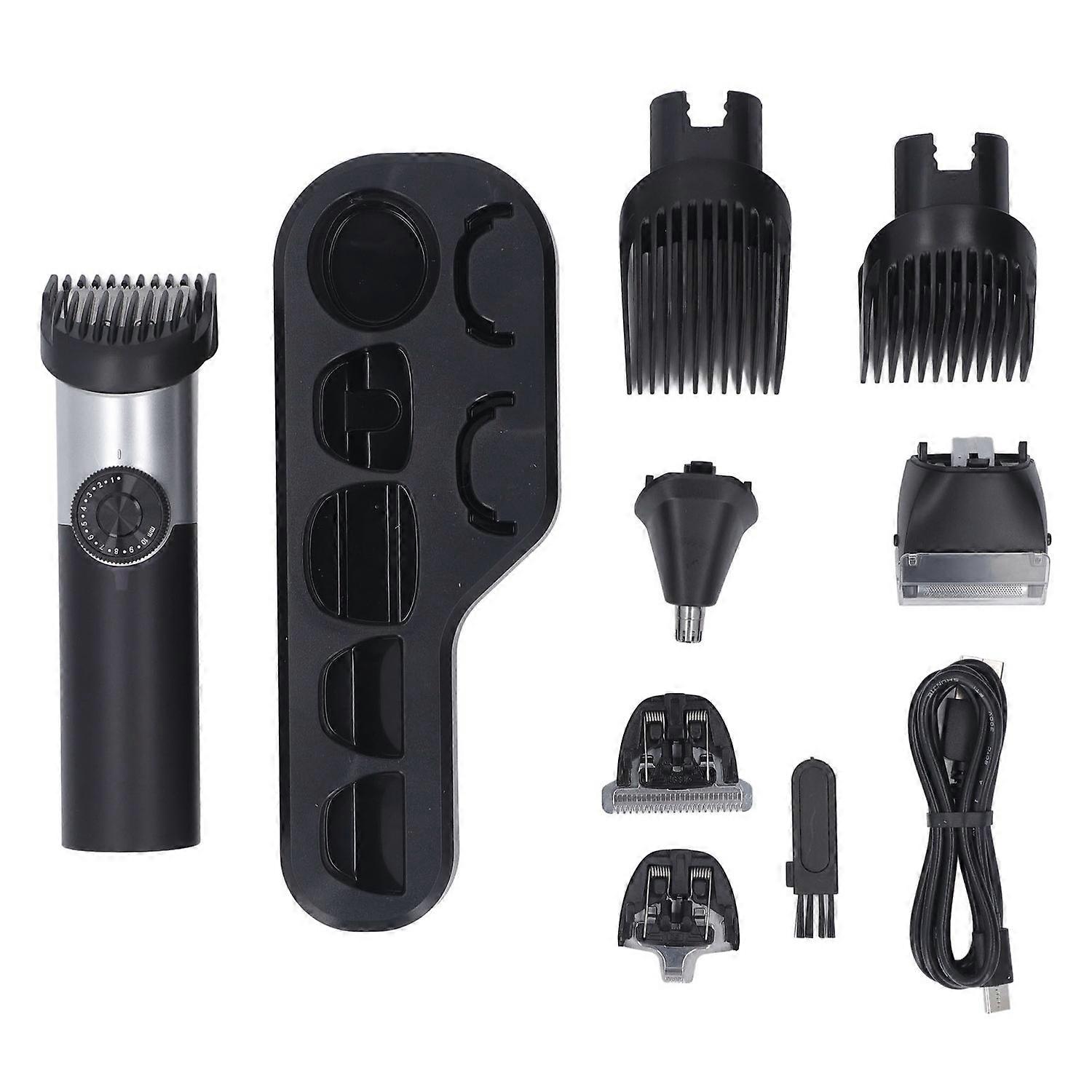 Feature: 1. 5 in 1 Design: Hair clipper set adopted multifunctional design, provide hair cutting, sculpting, sidebums cutting, beard trimming, nose hair trimming, which is more convenient to use. 2. 2 Speed Settings: Electric hair clipper adopted 2 speed regulation, suitable for both adults and children, with children lock function, long press to lock machine, not afraid to touch the switch by mistake. 3. Clear LCD Screen: Cordless hair trimmer adopted a large LCD screen design, clearly display the battery power, charging status, and child lock status, which is easy to read and operate. 4. 19 Length Adjust: Men hair clipper limit length can be adjusted in 19 gears, to meet the needs of different people and different hairstyles. Support full body washing, can be used in wet and dry conditions. 5. R Shaped Cutter: Hair clipper adopted R shaped rounded cutter head, stainless steel material, skin friendly and durable. Adopted USB rechargeable design for convenience during travel. Specification: Item Type: 5 in 1 Hair Clipper Kit Material: ABS, Stainless Steel Charging Method: USB Rechargeable Battery Information: 14500 Lithium Battery (800mAh) (Included) Rated Power: 5W Charging Time: About 120 minutes Usage Time When Fully Charged: About 90 minutes . Package List: 1 x Hair Clipper 1 x U Shaped Sidebums Cutter Head 1 x Sculpting Cutter Head 1 x Beard Trimming Head 1 x Nose Hair Trimming Head 2 x Guide Combs 1 x Hair Hrush 1 x Base 1 x User Manual 1 x USB Cable
