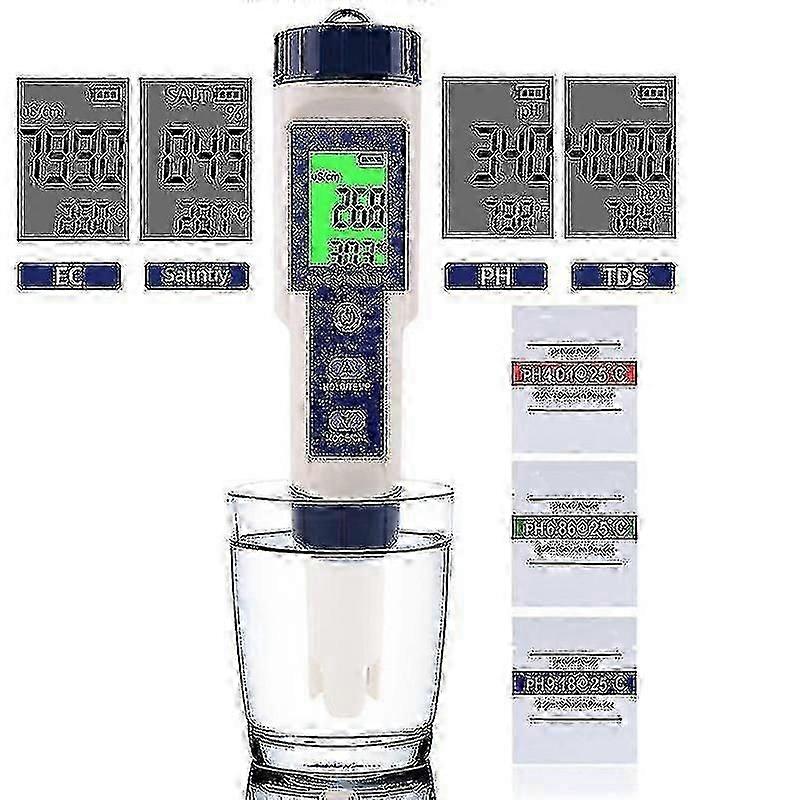 5-in-1 Water Quality Tester: Digital pH Tester with monitoring TDS, pH, salinity, EC meter and temperature measurement. TDS measurement range: 0-200000ppm, EC measurement range: 0-200000US/cm, PH measurement range: 0.01-14.00pH, salt water meter measurement range: 0.00-25.00%, temperature conversion function. High Precision: The high precision algorithm chip and electrodes of our digital water pH tester ensure accurate and fast response. When the measurement is stable, simply press the HOLD/TEMP key to lock the measurement and take it out for viewing, which is very simple. Two salinity meters: A digital pH meter can detect the salinity of table salt. At the same time, it can detect the salinity of seawater. Food salinity measurement range: 0.00-25.00%, seawater salinity measurement range: 10.1-200.0pptAuto power off function and large screen display: The pH tester has a backlit LCD to help you see the measurement results clearly in any situation. The auto power off function turns off the power after 5 minutes, saving power without any operation. A fully transparent liquid crystal (LCD) is used to display the 4-digit value and the corresponding physical unit of quantity. Automatic Temperature Compensation: Temperature may affect reading levels, digital hydroponic PH meter has a range of 0C-60C (-0-140F), automatic temperature compensation ensures you get the best readings, so you can rest assured Test in any environment. Waterproof grade: TP67 (it can still be used after falling into the fish tank)Interchangeable ProbeAuto Calibration