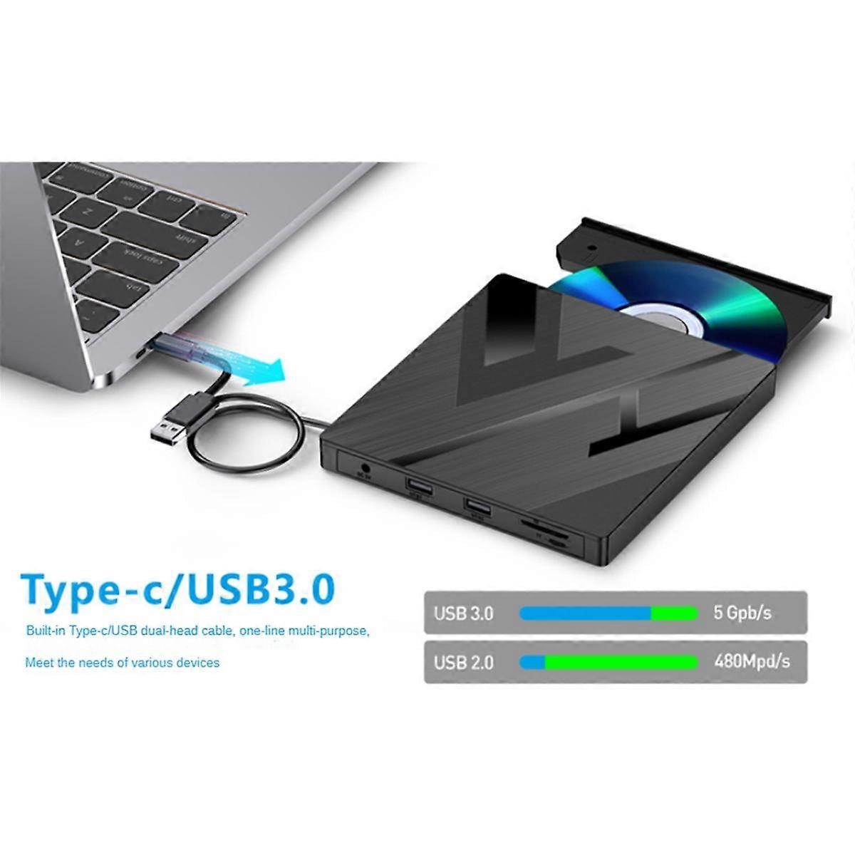 5-in-1 external DVD drive: It is not only an external CD/DVD drive, but also a USB hub. With 2 x USB 2.0 ports, 1 x card slot, 1 x TF card slot, 1 x DC5V power port. PS: port and TF slot cannot be used at the same time. The DC power port is for charging only. Easy to use, easier. The external CD drive does not require any additional drivers. Connect external DVD drive for laptop directly to your USB or Type C port on your PC. CD Rom external drive for laptop with advanced burning technology, e.g. supported CD-R, CD-RW, DVD-R, DVD-RW. Max DVD-ROM reading speed 8X; Max CD-ROM reading speed 24X and maximum DVD burning speed 8X; Max CD burning speed 24X. The external CD drive for laptop is compatible with for Windows XP/7/8/10, VISTA, for MacOS 8.6 or higher and serves as a perfect complement for /for /for /for /for /for /for , , Ultrabooks, PCs, desktops and other without an internal drive (not compatible with Windows98!). External CD DVD drive for pc - Working with USB 3.0 High Speed interface, brings you faster data transfer speed (up to a maximum of 5Gbps). A unique burn-proof control chip is embedded in the device. During recording, you can effectively prevent the possibility of disc breakage and extremely strong error correction function when reading the disc. With the cable integrated into the USB DVD drive external, the optical drive can be easily stored in a bag or drawer. NOTE:, tablets, and Blu-ray disk, 3D, 4K, 2K of DVD, car, smartphone, projector, for , for , for Switch, Chrome OS are not supported. Colour:Black Material:ABS Package Contents: 1 * External CD/DVD Drive for Laptop 1 * DC Power Supply Cable Only the above package content, other products are not included. Note: Light reflection and different displays may cause the color of the item in the picture a little different from the real thing. The measurement allowed error is +/- 1-3cm.