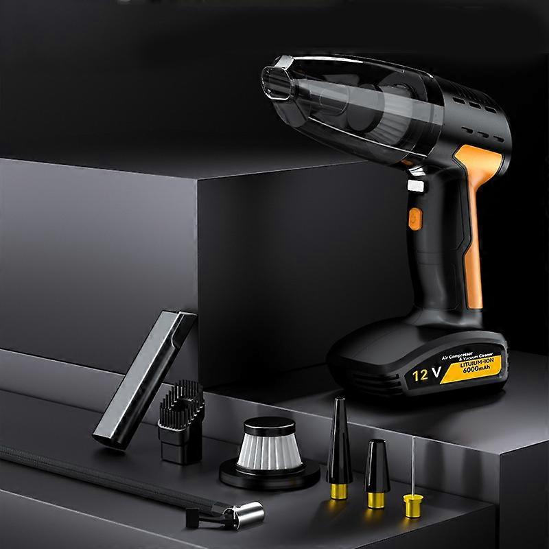 5 In 1 60W Double Motor Car Vacuum Cleaner With Blowing Air Pump Pressure Measuring Lighting Function 1. Five-in-one functions: You can have vacuuming, inflating, blowing, lighting, and pressure measuring functions in one product at the same time for only one price (any function is not inferior to similar products) 2. Multi-cleaning brush heads truly meet the needs of all-round home and car cleaning 3. Aerodynamic aluminum energy-gathering double fan blades break the history of plastic fan blades in the industry. The speed is faster and the life is longer. It also enables the machine to increase suction on the basis of low noise. 4. Turbocharged double pumps quickly inflate, master the air pressure doubling technology, and the inflation efficiency is greatly improved 5. Equipped with 5C power lithium battery, 365 days of long-lasting standby (only wireless model with lithium battery) 6. The screw press inflation hose locks the gas tightly and is more convenient to use 7. The wired model is equipped with a 3-meter cigarette lighter cable, which provides a large enough inflation range for various models and ensures that all four wheels can be inflated. 8. The LCD digital display tire pressure gauge will automatically stop when the preset tire pressure is full, and support the adjustment of the air pressure value 9. Quadruple cooling is not hot: multi-mesh heat dissipationdouble motoraluminum fan bladesmart chip Parameter: 1. Output power: 60 (W) 2. Rated voltage: DC11.1 (V) 3. Lighting lamp: two LEDs, 0.5W 4. Cylinder specification: 17 cylinders 5. Material: ABS 6. Wireless built-in battery Battery capacity: 6000mAh 7. Product specifications: 21 X 9 X 26 (length x width x height cm) 8. Product net weight: net weight 650 grams Accessories list: brush, flat tube, inflatable tube, USB charging cable3m cigarette lighter cable, three kinds of inflatable accessories