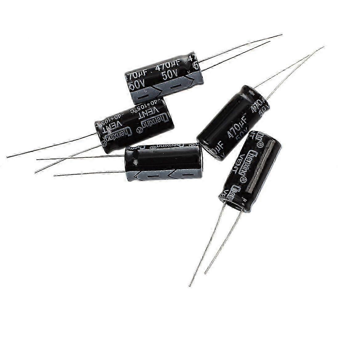 Product Name: Aluminum Electrolytic Capacitor;Type: Radial Lead;Maximum Temperature: 105 Celsius Voltage: 50V;Capacitance: 470uF;Capacitance Tolerance: 20% Size: 10 x 20mm / 0.39" x 0.78" (D*L);Lead Spacing: 5mm;Lead Length: 22mm, 26mm External Material: Aluminum;Weight: 10g Features:Standard . Aluminum electrolytic capacitor with radial lead. Polarized, the longer lead is positive electrode while the shorter one is negative electrode. Widely used in electronics, such as computer motherboard, TV, speaker, digital camera, etc. Package Contents: 5 x Electrolytic Capacitors Only the above package content, other products are not included. Note: Light and different displays may cause the color of the item in the picture a little different from the real thing. The measurement allowed error is +/- 1-3cm.