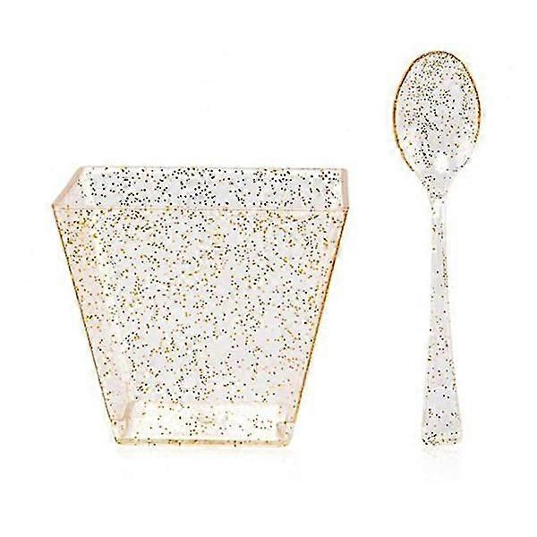 Safe and healthy: Mini dessert cups are made of 100% food-grade plastic, no BPA, no toxic or harmful substancesModern design: The elegant golden glitter dessert cup is the perfect way to showcase your favorite finger foods, mousses, snacks, desserts and appetizersParty Supplies: Suitable for baby shower, birthday, carnival, wedding, holiday, barbecue, dinner, outdoor party, cocktail or any party occasionColour: GoldenMaterial: PlasticSize: 60 mlPackage Contents:25 x small square cups25 x forksOnly the above package content, other products are not included.Note: Light and different displays may cause the color of the item in the picture a little different from the real thing. The measurement allowed error is +/- 1-3cm.